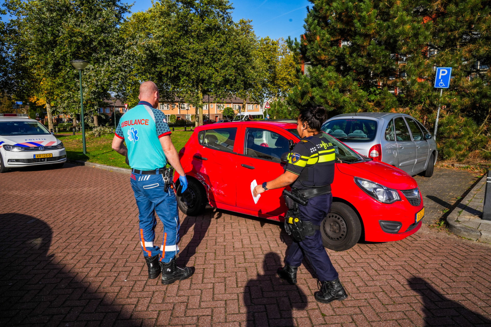 De automobilist reed net een parkeervak uit toen de motorrijder passeerde, waardoor de twee voertuigen op elkaar botsten. De motorrijder is ter plaatse behandeld in de ambulance.