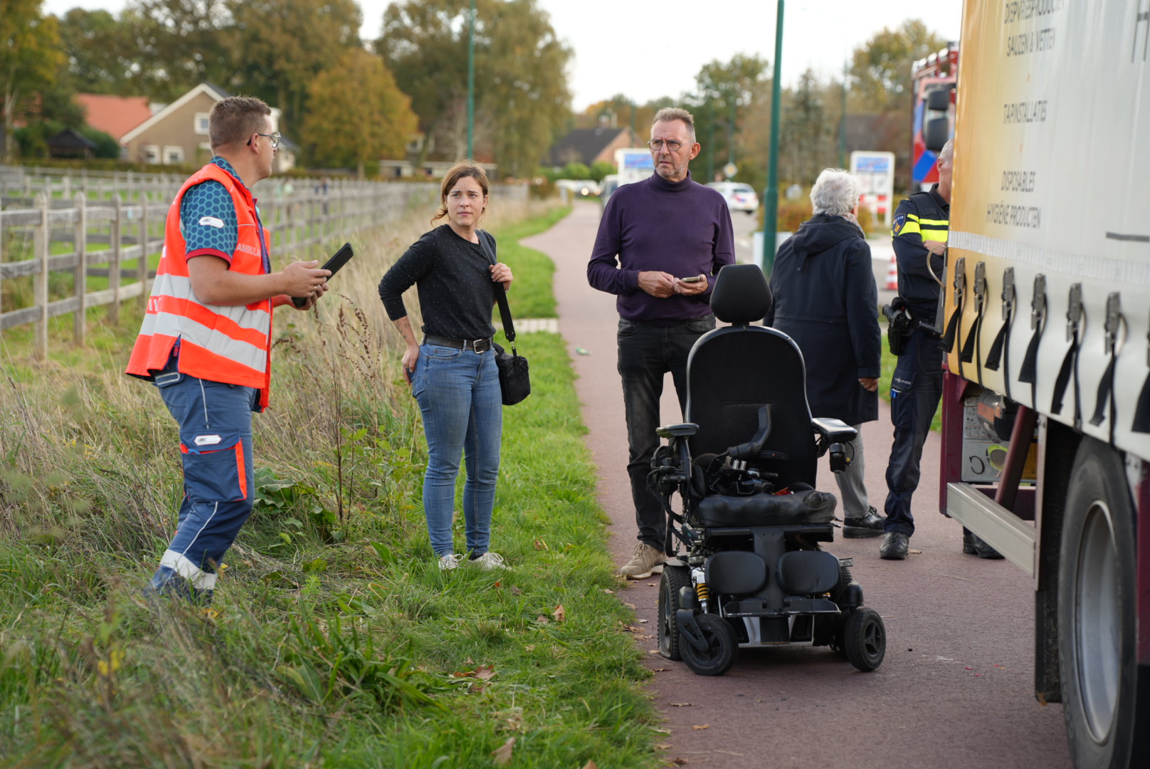 De vrouw is met onbekend letsel per ambulance naar het ziekenhuis gebracht. De politie heeft de vrachtwagenchauffeur een boete gegeven voor het parkeren op het fietspad. De vader van het slachtoffer haalde de rolstoel op. De gealarmeerde brandweer en traumahelikopter hoefden niet in actie te komen.