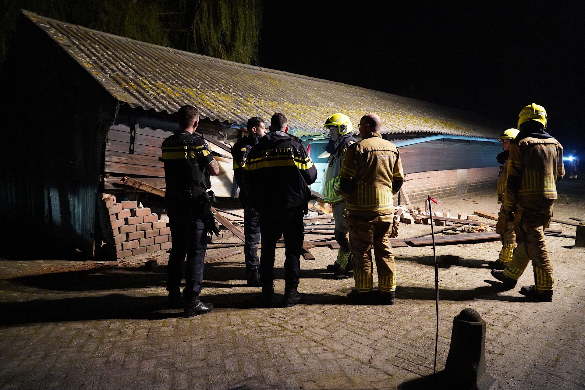 De brandweer werd opgeroepen om de situatie te beoordelen en om te controleren of er mogelijk nog andere personen in het voertuig zaten. Door de zware schade aan de schuur, die op instorten staat, heeft de brandweer de omgeving afgezet.