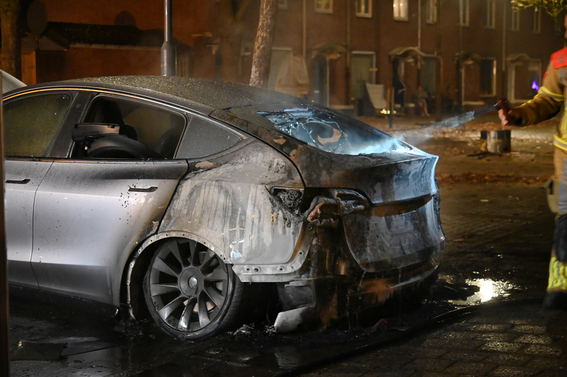 De brandweer was snel ter plaatse, maar kon niet voorkomen dat de achterzijde van het voertuig zware schade opliep. Om de situatie veilig te stellen, werd de motorkap geforceerd om de stroomvoorziening van de elektrische auto uit te schakelen.