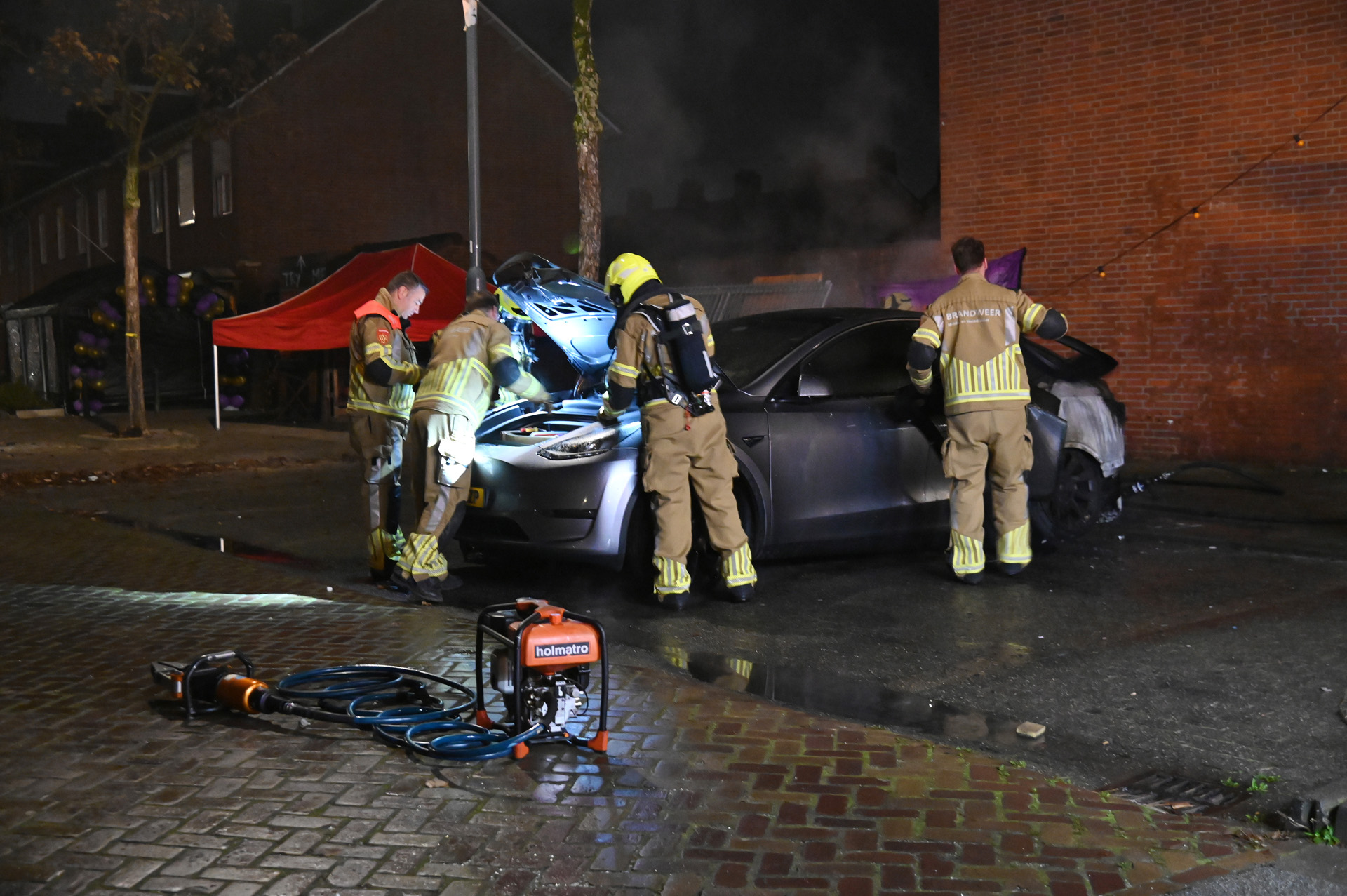 De brandweer was snel ter plaatse, maar kon niet voorkomen dat de achterzijde van het voertuig zware schade opliep. Om de situatie veilig te stellen, werd de motorkap geforceerd om de stroomvoorziening van de elektrische auto uit te schakelen.