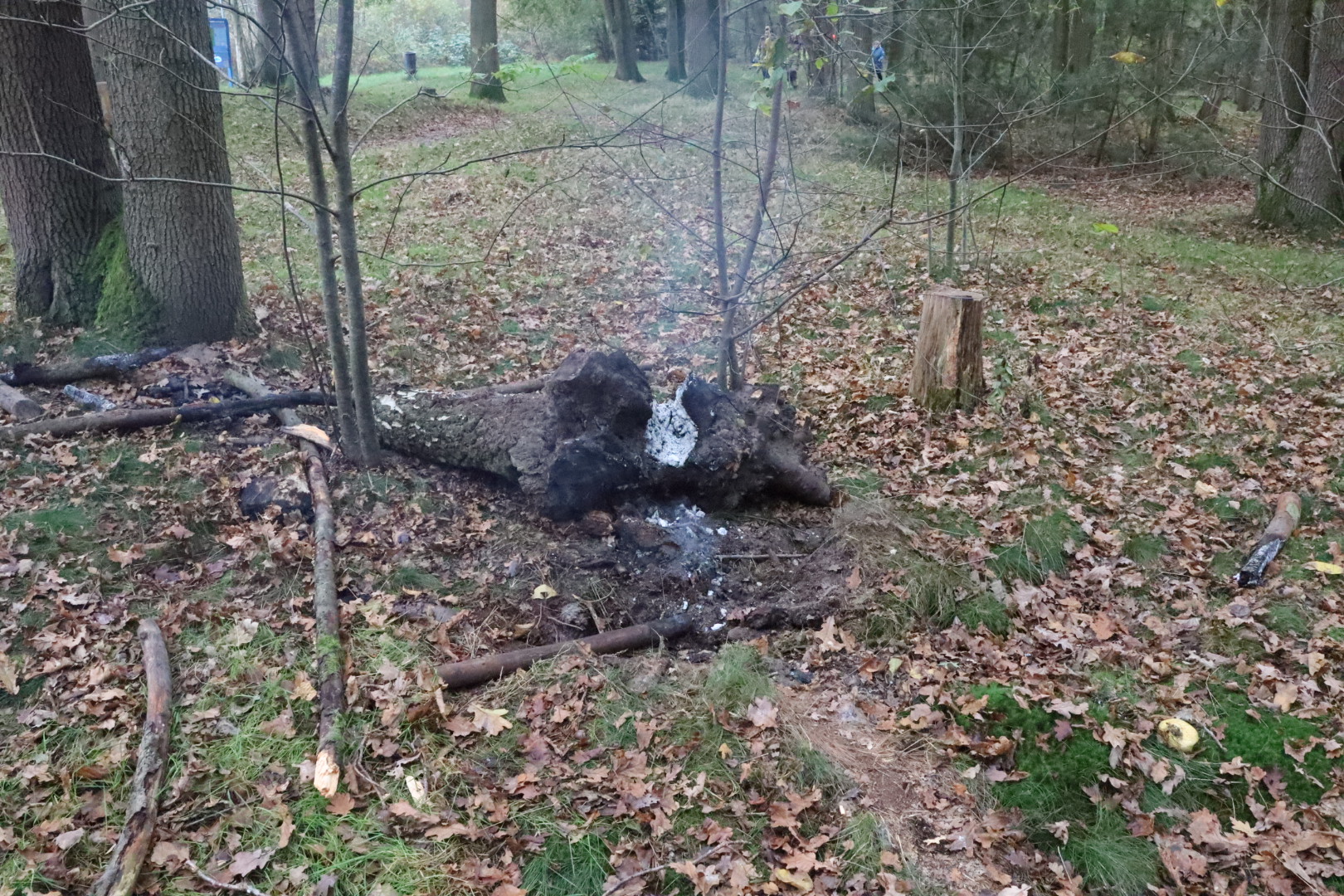 Rond de stronk lagen ook enkele takken die hadden gebrand. De brandweer wist het vuur snel te doven met twee emmers water. Er raakte niemand gewond, en de situatie was snel onder controle.