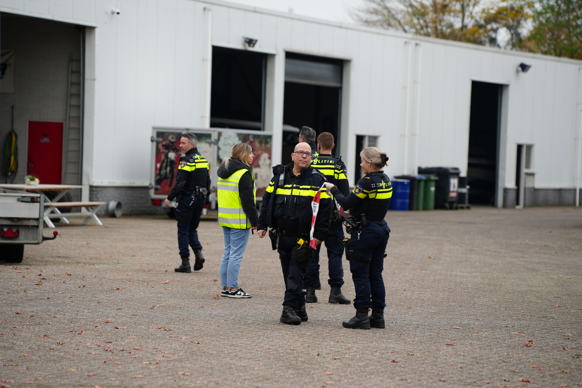 Specialisten zijn ter plaatse om onderzoek te doen in het drugslab. Het terrein is afgesloten en wordt bewaakt om de situatie onder controle te houden.