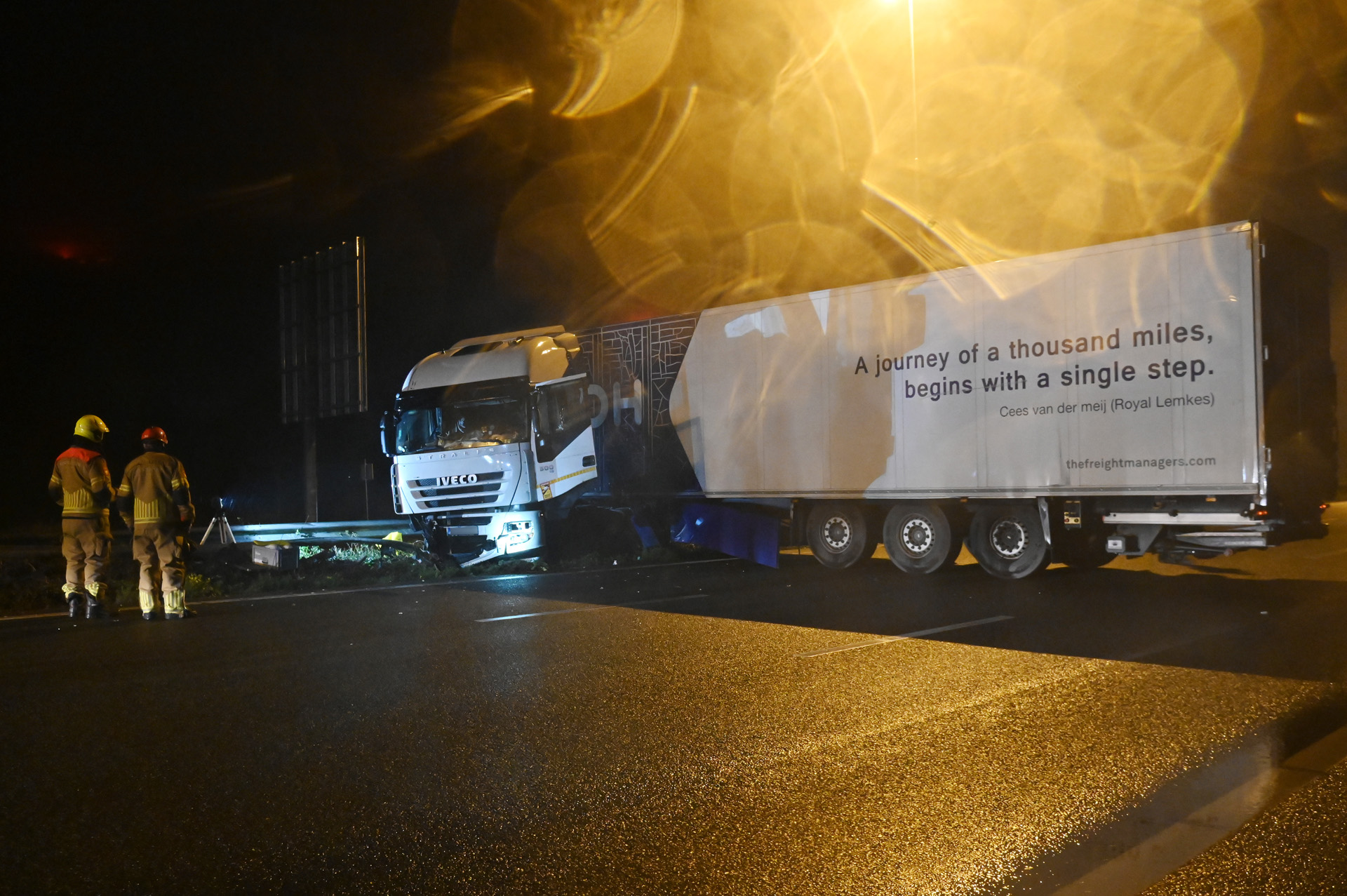 Vrachtwagen schaart en schiet door vangrail, snelweg dicht