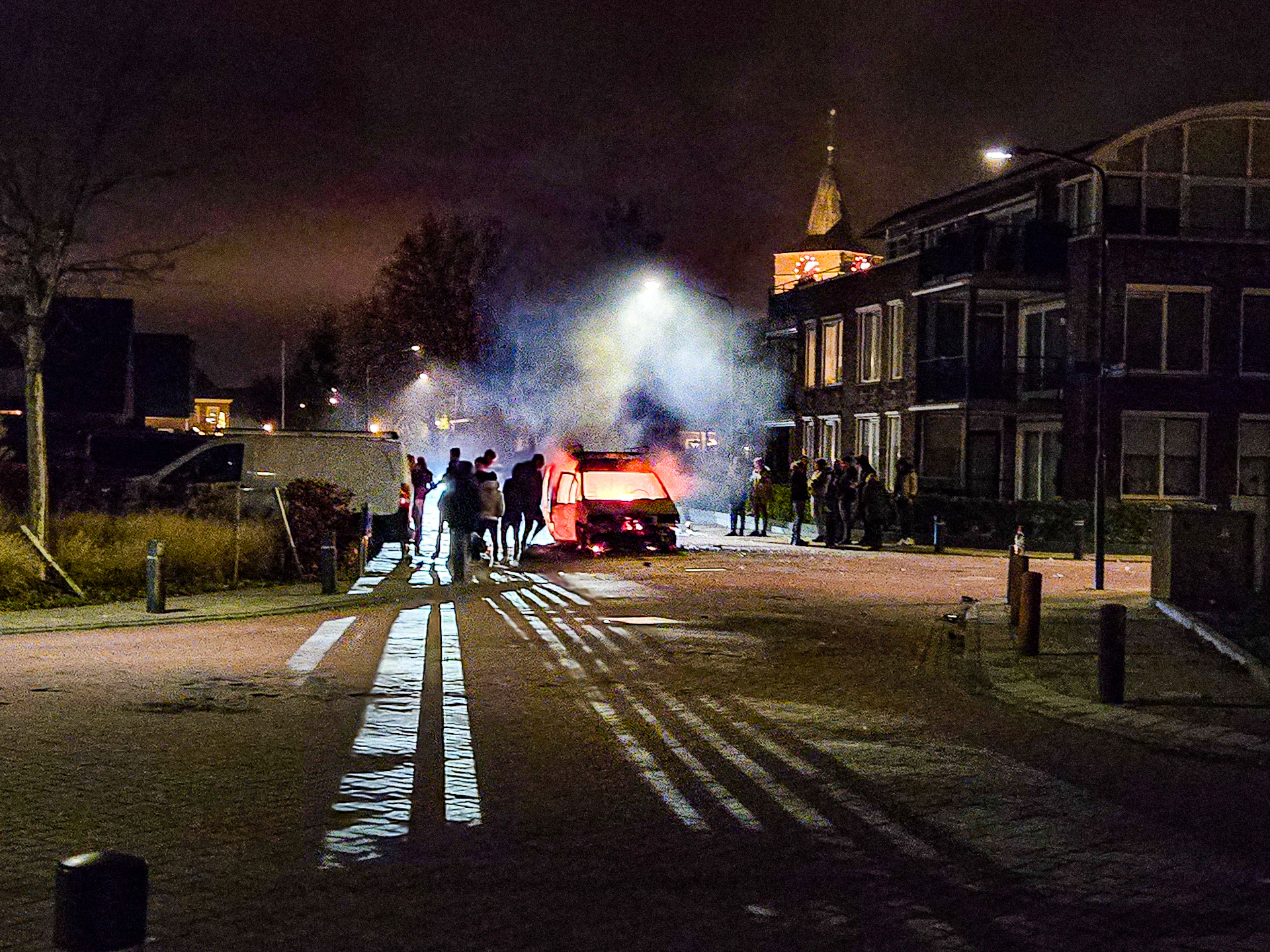 Auto gaat volledig in vlammen op in Veen: ruim 100 jongeren kijken toe op beruchte kruising