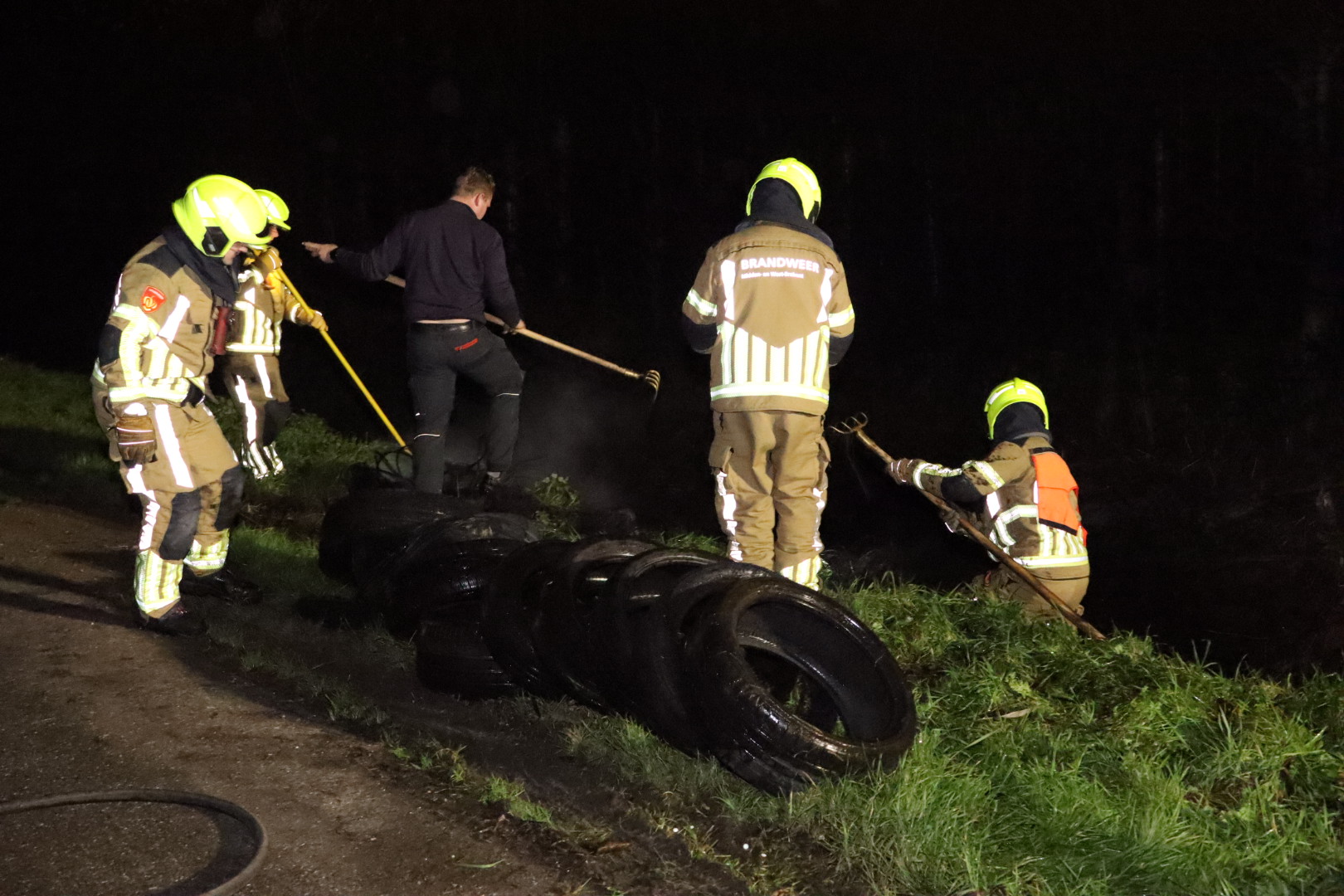 De brandweer had de vlammen snel onder controle en haalde ongeveer 30 autobanden uit de sloot. Het is nog onbekend wie de banden heeft gedumpt.