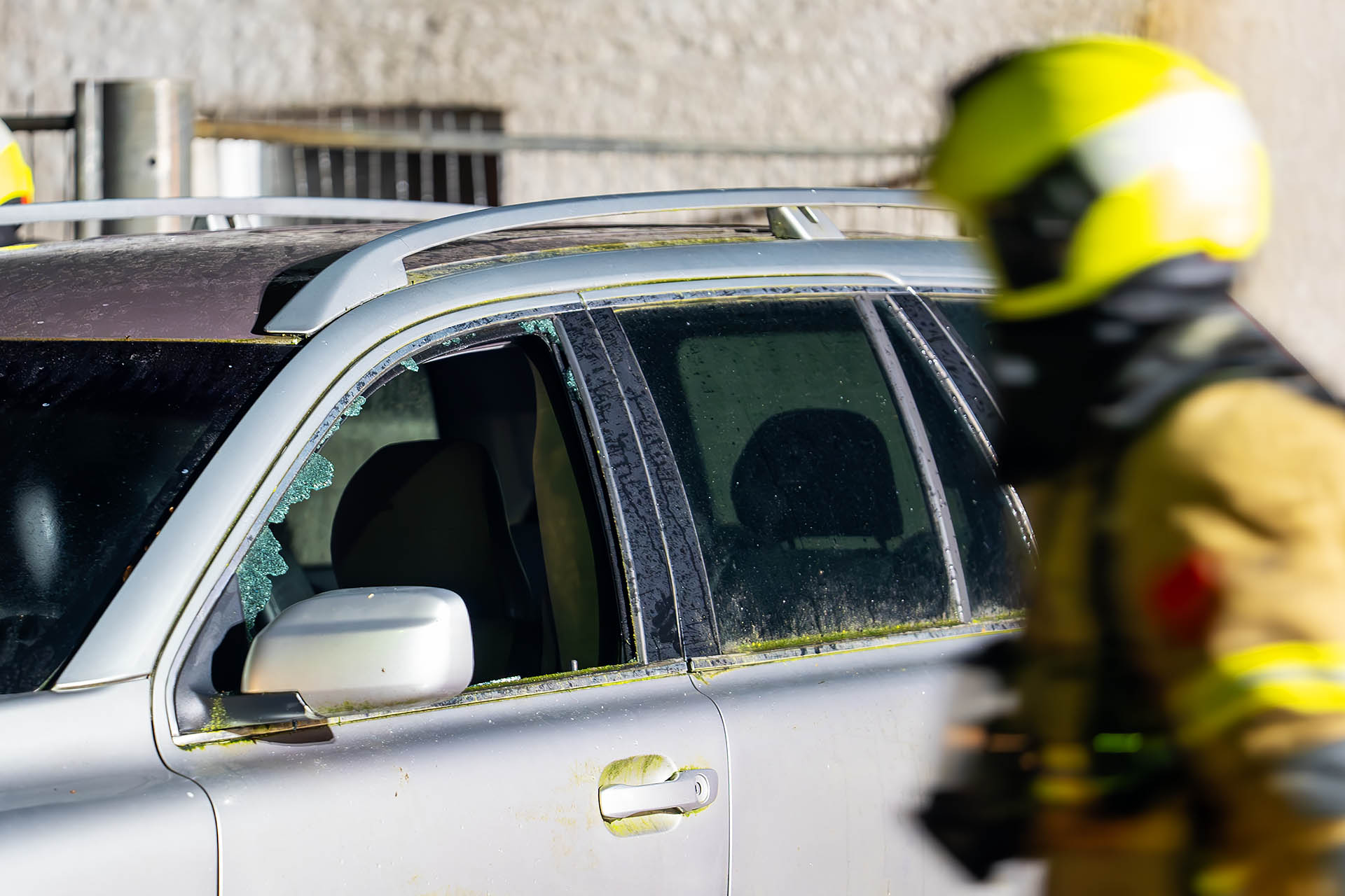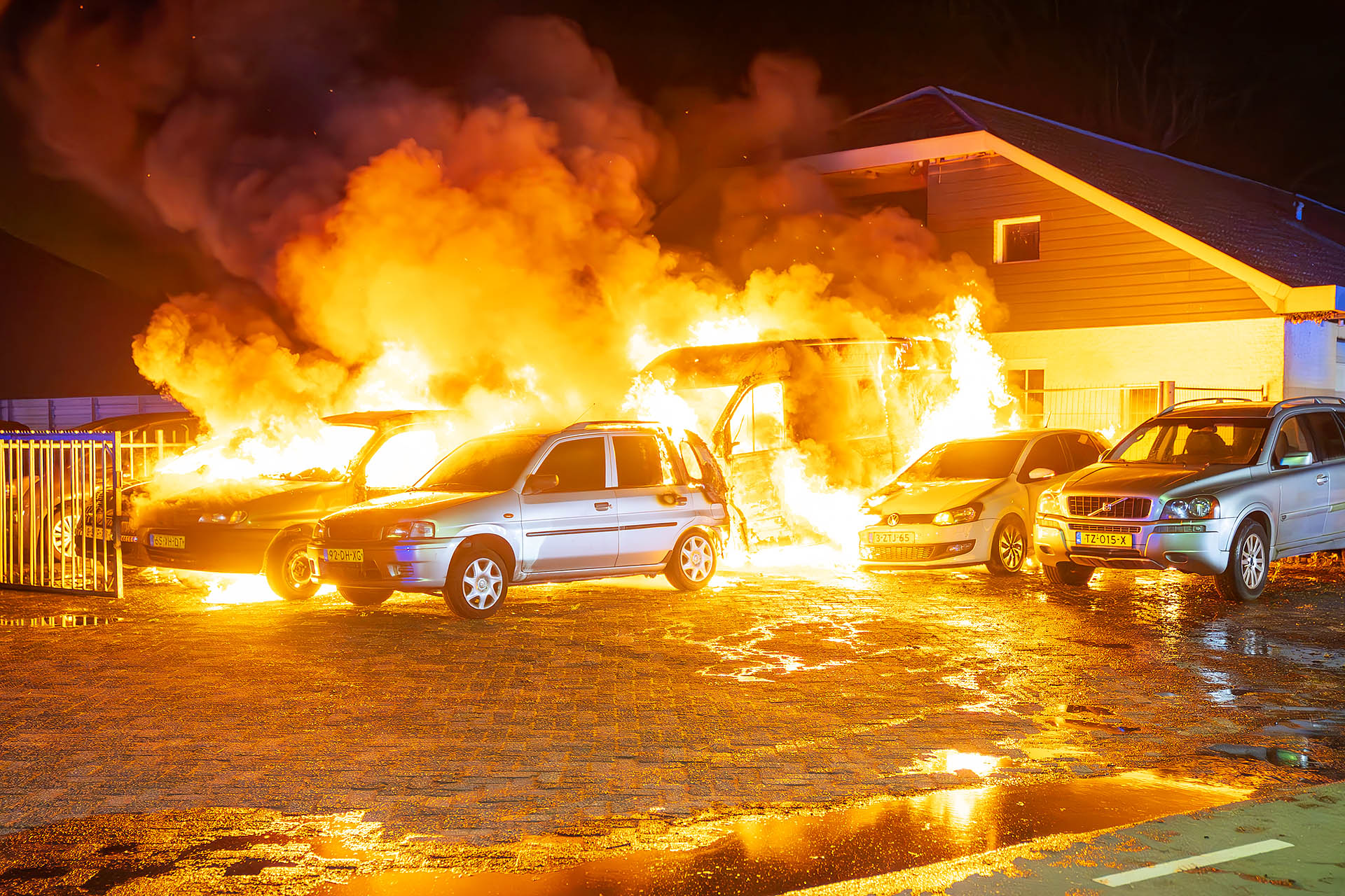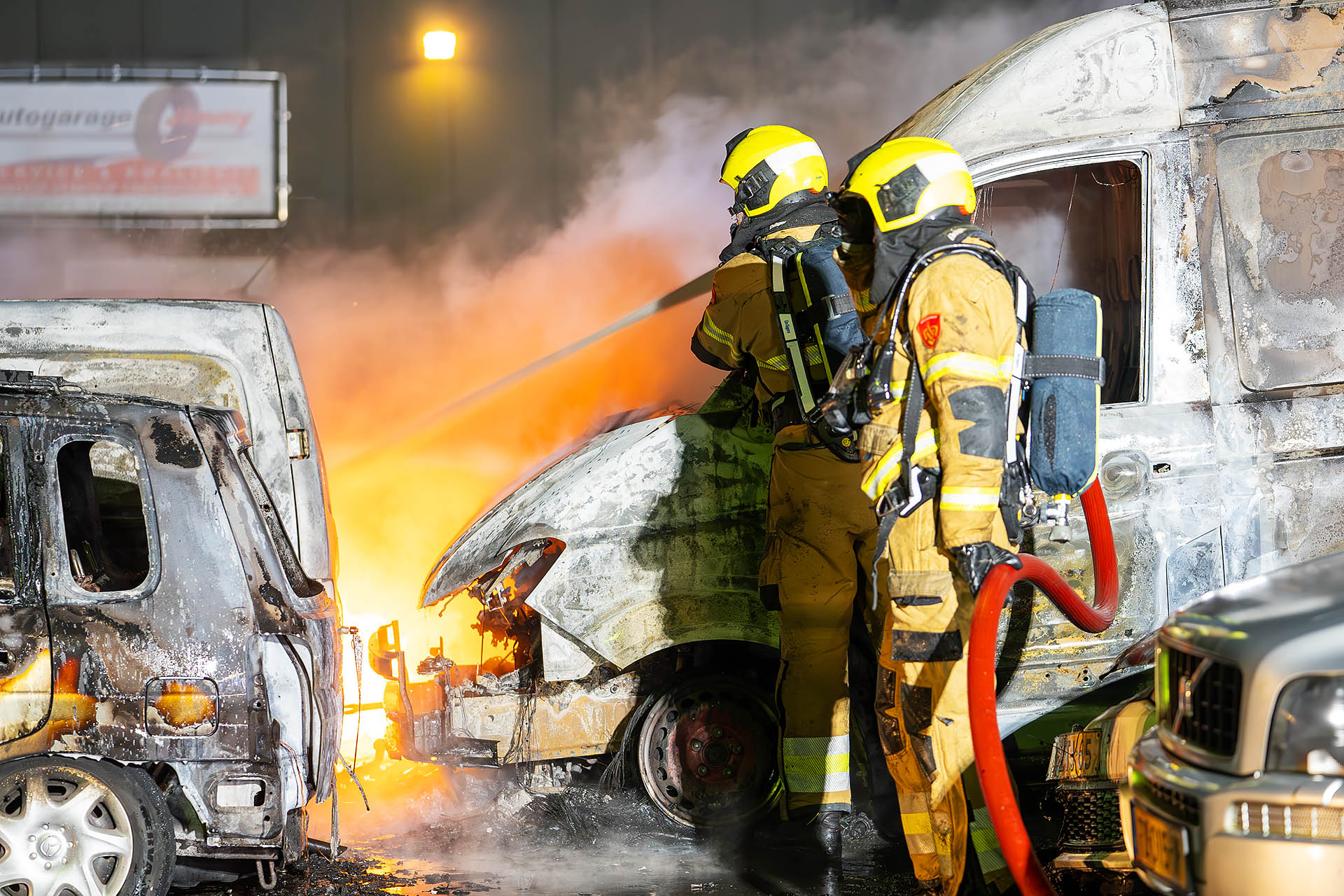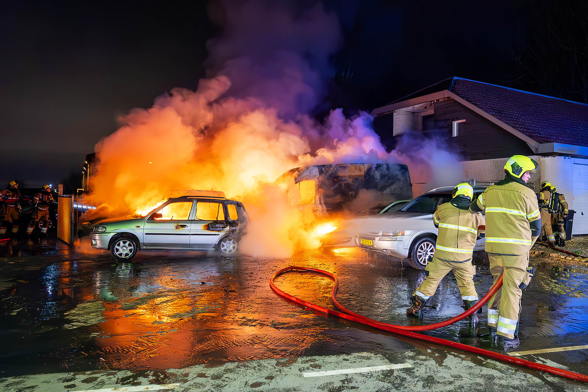 De brandweer trof bij aankomst een grote vuurzee aan en schaalde op naar middelbrand. Met twee blusvoertuigen, een waterwagen en water uit een sloot tegenover het pand wisten ze de brand onder controle te krijgen. Volgens de brandweer waren de getroffen voertuigen niet elektrisch.
