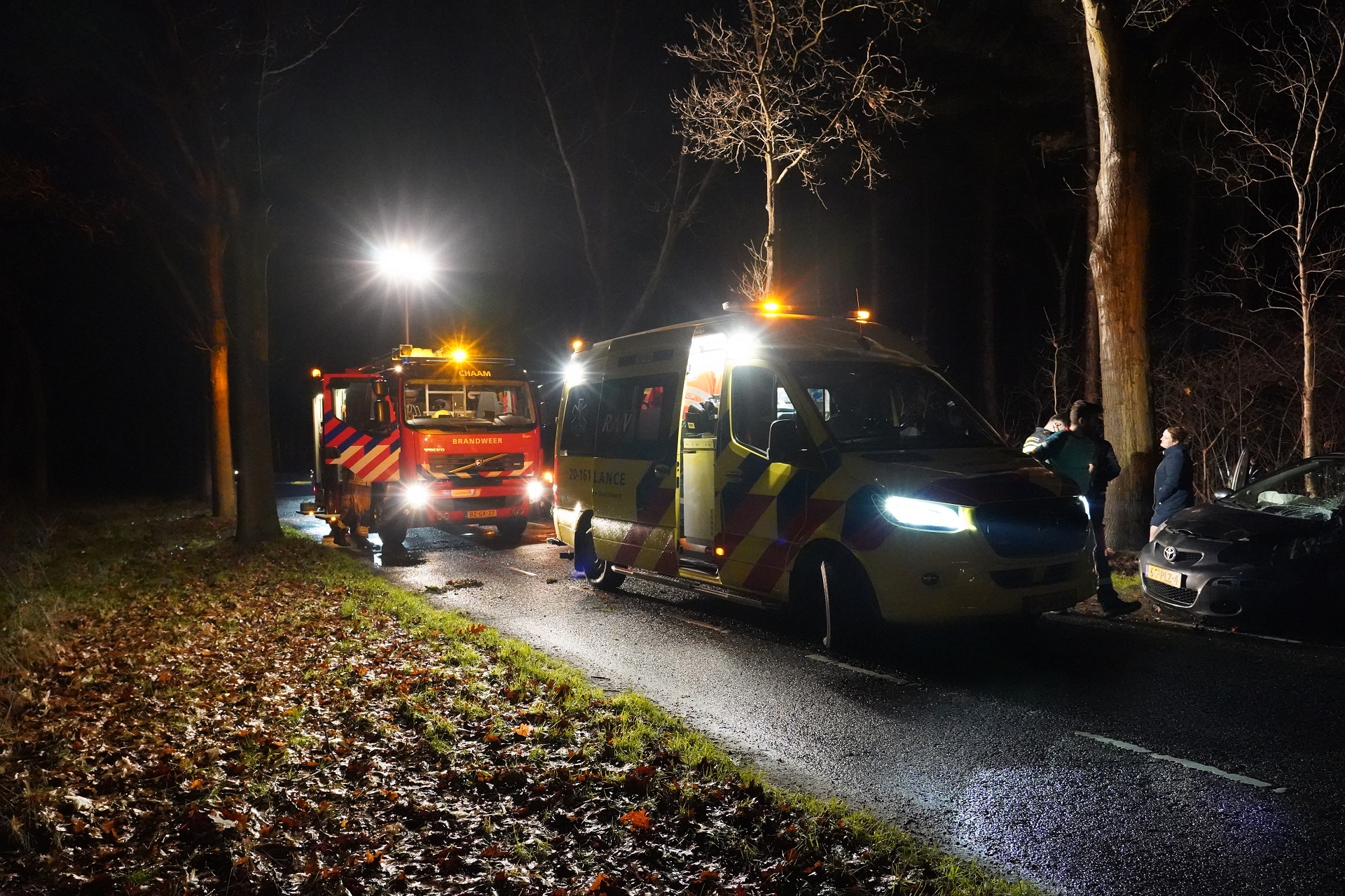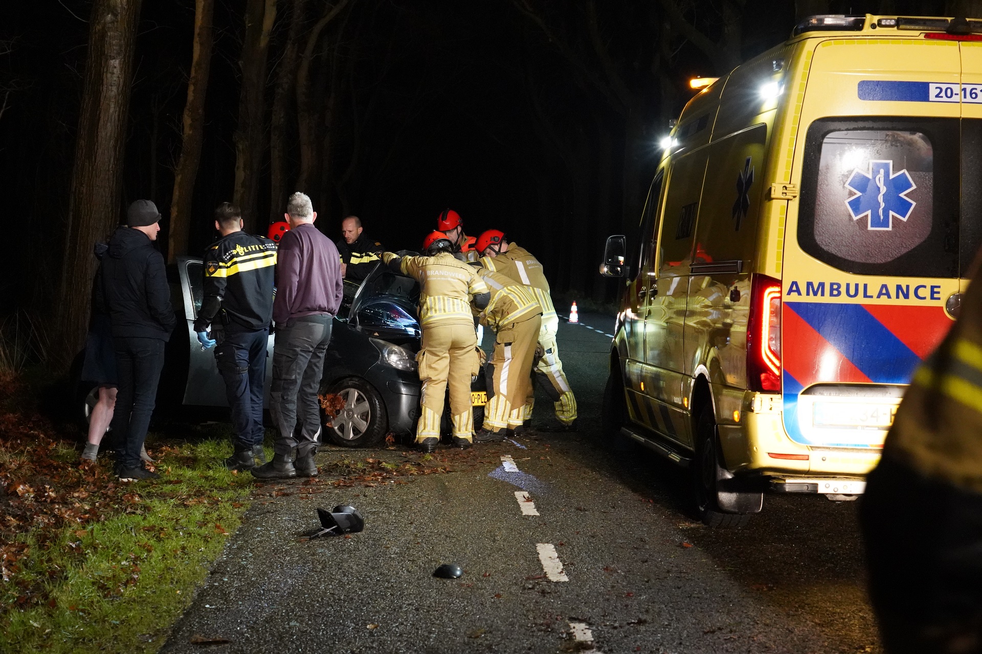 Rond 01.45 uur raakte een automobilist de macht over het stuur kwijt en botste tegen een boom. De hulpdiensten waaronder de brandweer, meerdere ambulances en een trauma helikopter rukten massaal uit. Het slachtoffer werd in een ambulance behandeld waarna hij met spoed naar het ziekenhuis is vervoerd. Omdat niet bekend was of hij de enige inzittende was zoek de brandweer in het naastgelegen bos.