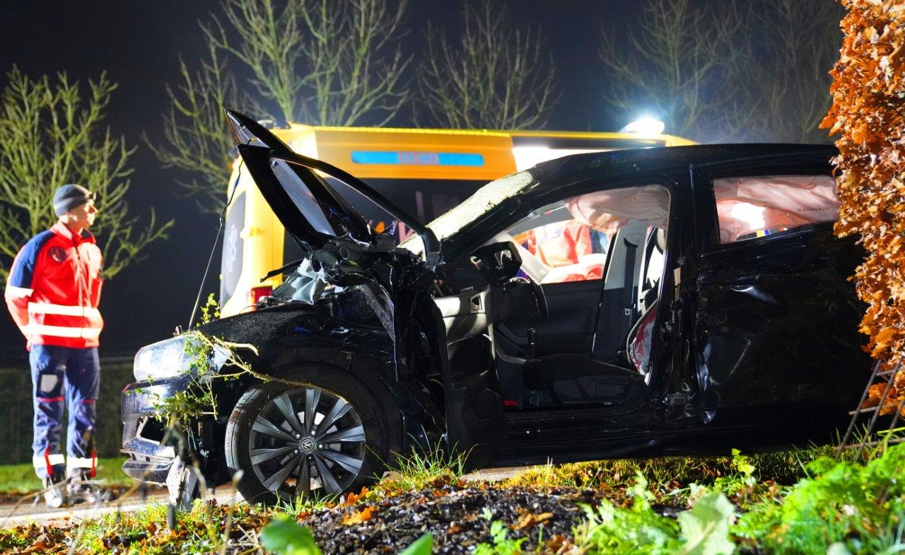 Auto botst tegen twee bomen en lantaarnpaal, twee gewonden naar het ziekenhuis