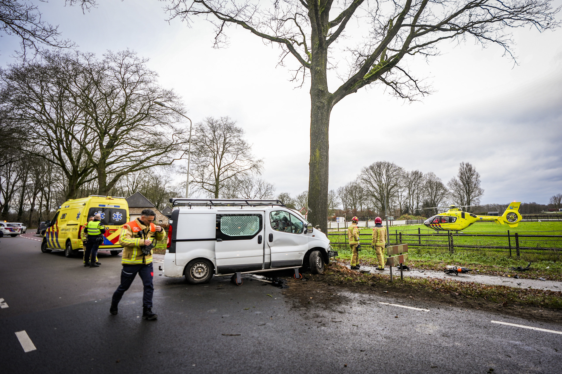 De schade aan het busje is groot. De brandweer heeft de man uit het voertuig bevrijd, terwijl een traumahelikopter ter plaatse kwam om eerste hulp te verlenen. Het slachtoffer is daarna met spoed per ambulance naar het traumacentrum in Nijmegen gebracht.