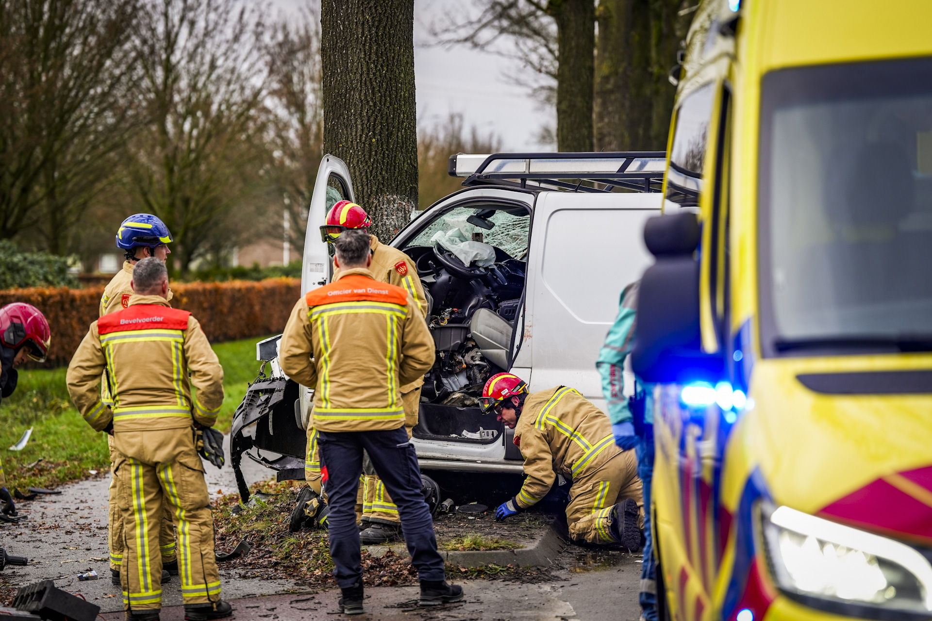 Bestuurder van bedrijfsbus zwaargewond bij botsing tegen boom