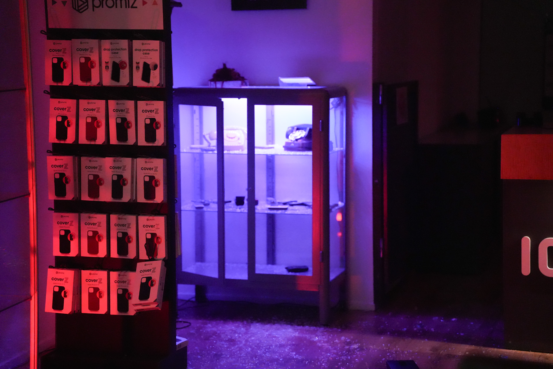 De inbrekers sloegen een raam in om binnen te komen, waarna het alarm afging en een rookmachine de ruimte vulde. Door de rook wisten de daders slechts tientallen telefoonhoesjes en enkele oude telefoons uit een vitrinekast mee te nemen.