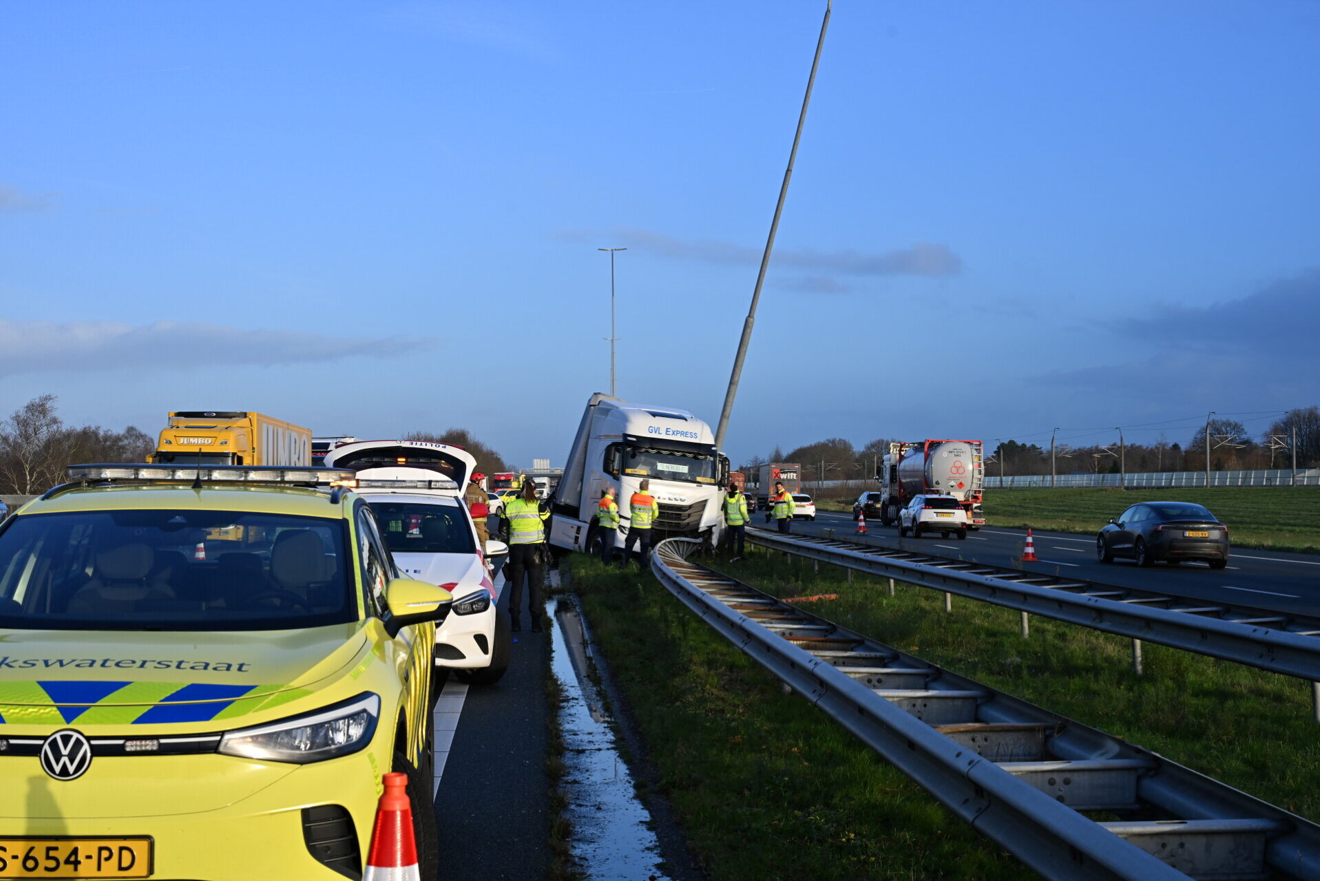Vrachtwagen verliest lading houtkachelkorrels, deel van snelweg afgesloten