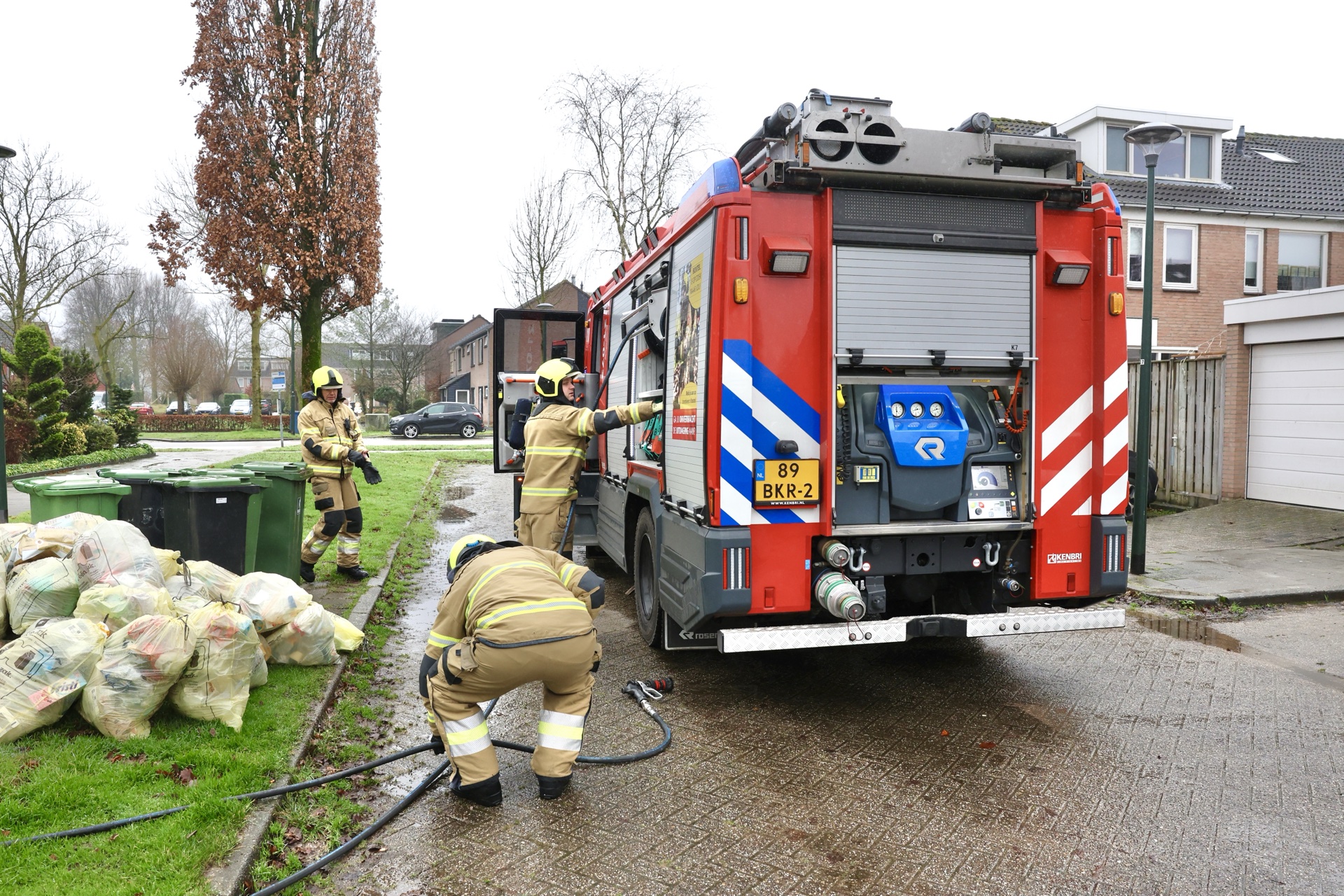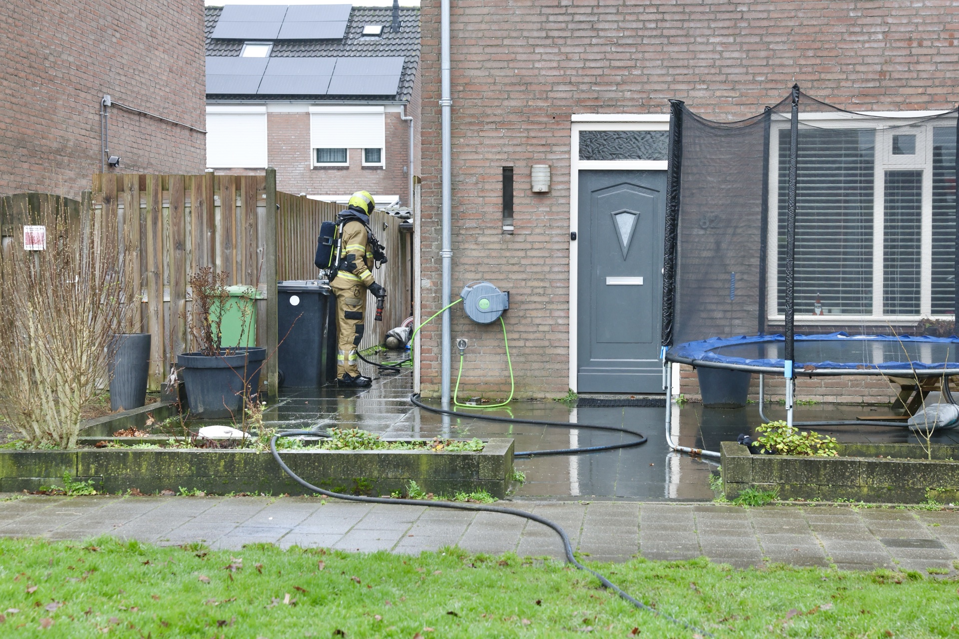 Een eerste bluspoging met een tuinslang wist de grootste vlammen te doven, waarna de brandweer het vuur volledig heeft geblust. Ook een ambulance kwam ter plaatse om personen die hadden geblust te controleren op mogelijke rookinhalatie.