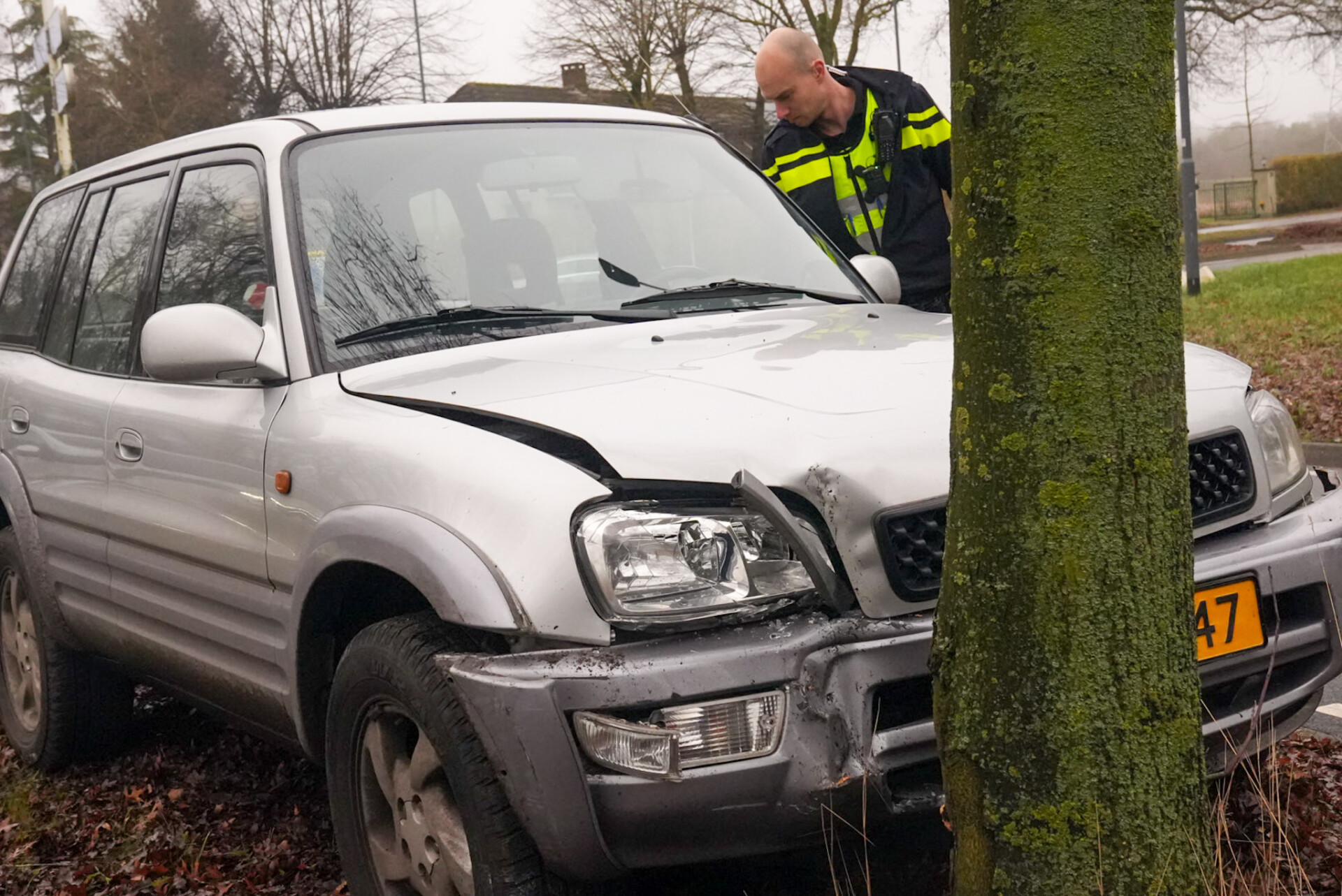 Man raakt bij verkeersplein van de weg en bots tegen boom