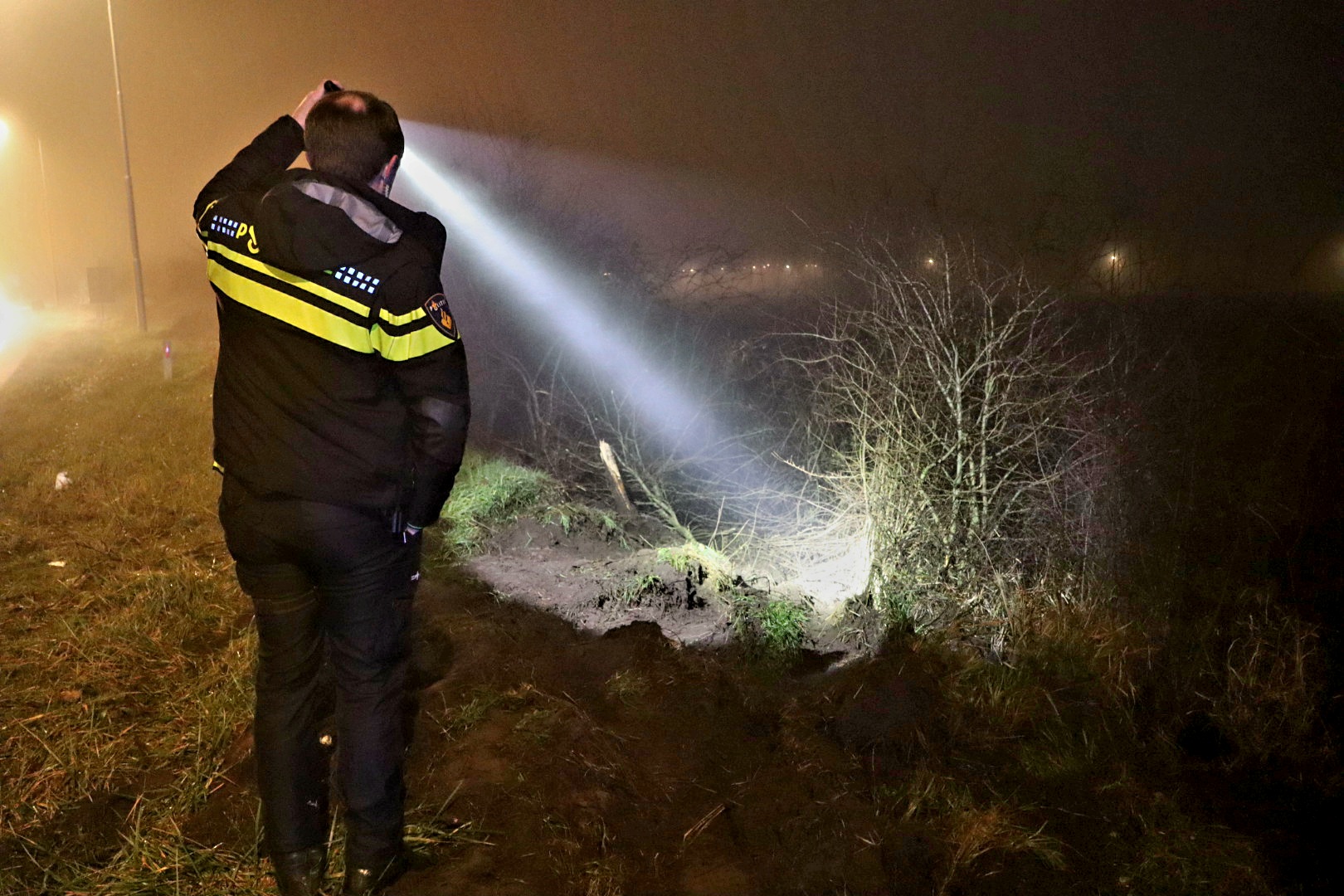 De bestuurder verloor door onbekende oorzaak de controle over het stuur, ramde een verkeersbord en kwam in de struiken van het talud tot stilstand. In de auto zaten drie mannen, die ongedeerd bleven.