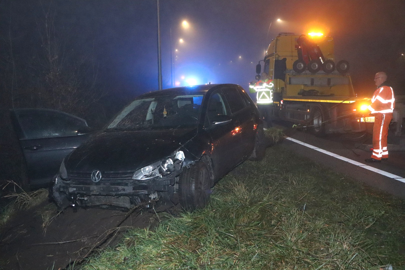 De bestuurder verloor door onbekende oorzaak de controle over het stuur, ramde een verkeersbord en kwam in de struiken van het talud tot stilstand. In de auto zaten drie mannen, die ongedeerd bleven.