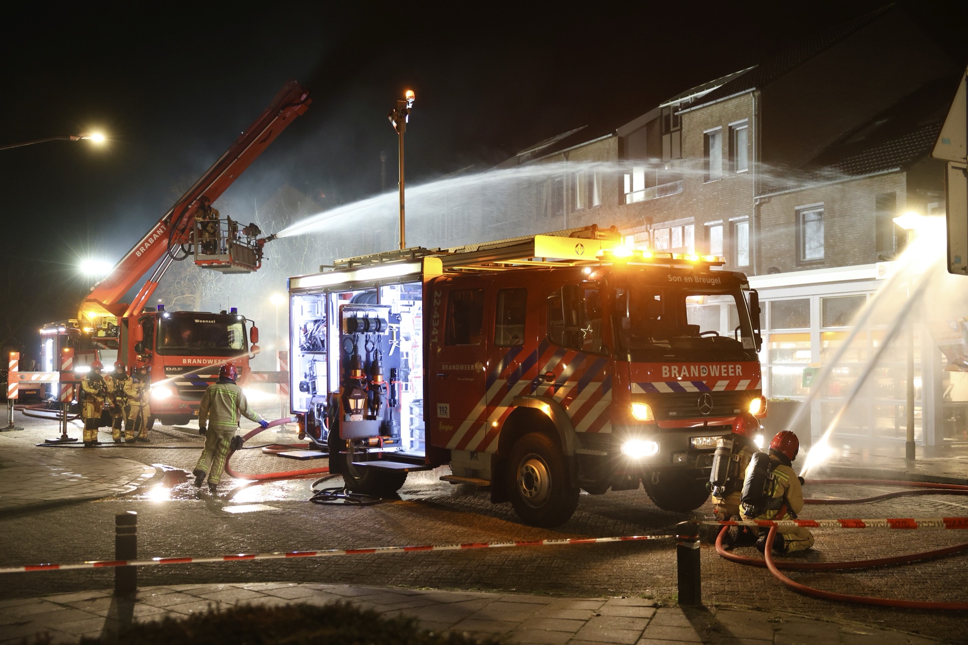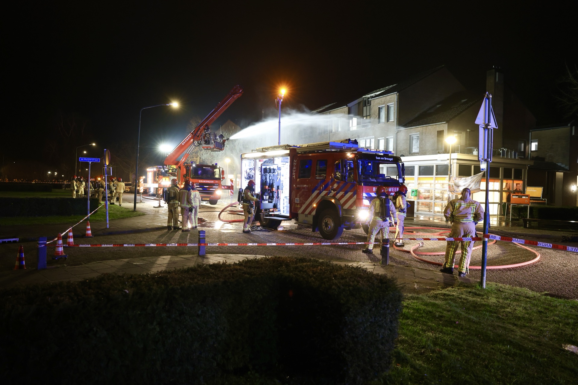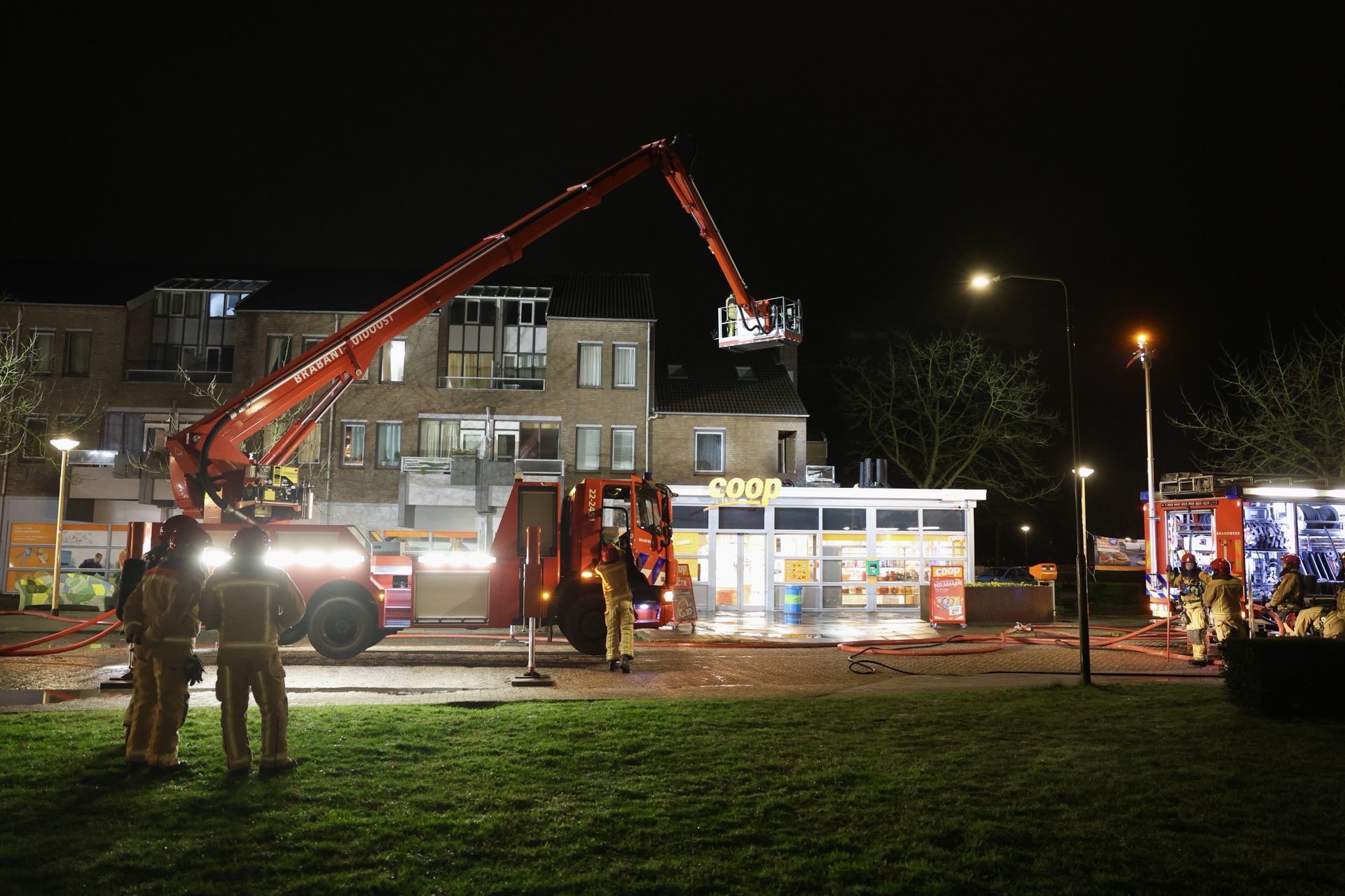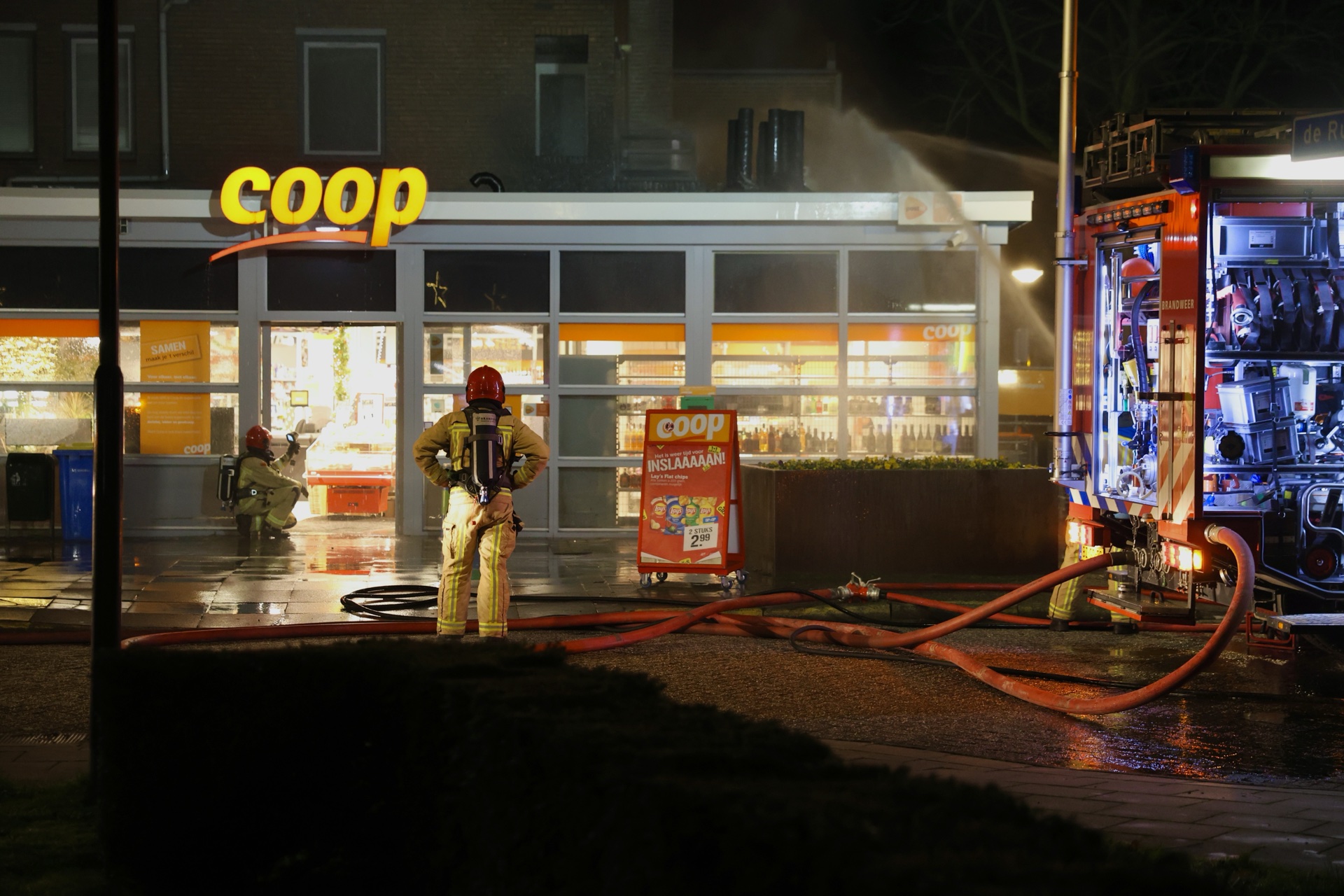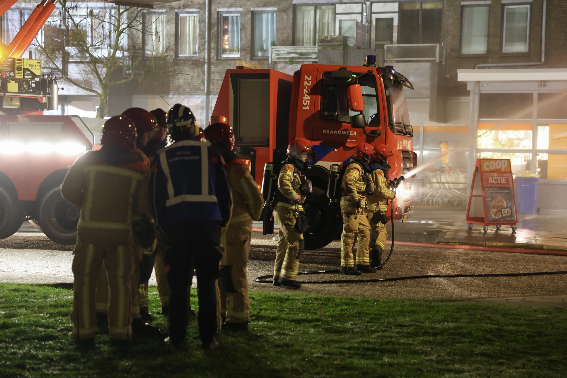 De brand werd snel onder controle gebracht en het sein brandmeester is inmiddels gegeven. De brandweer heeft de gasflessen gekoeld en het dak geïnspecteerd met een warmtecamera. De supermarkt liep brandschade aan het dak op en kampt binnen met waterschade. Bewoners mochten na de bluswerkzaamheden terugkeren naar hun appartementen. Er raakte niemand gewond.