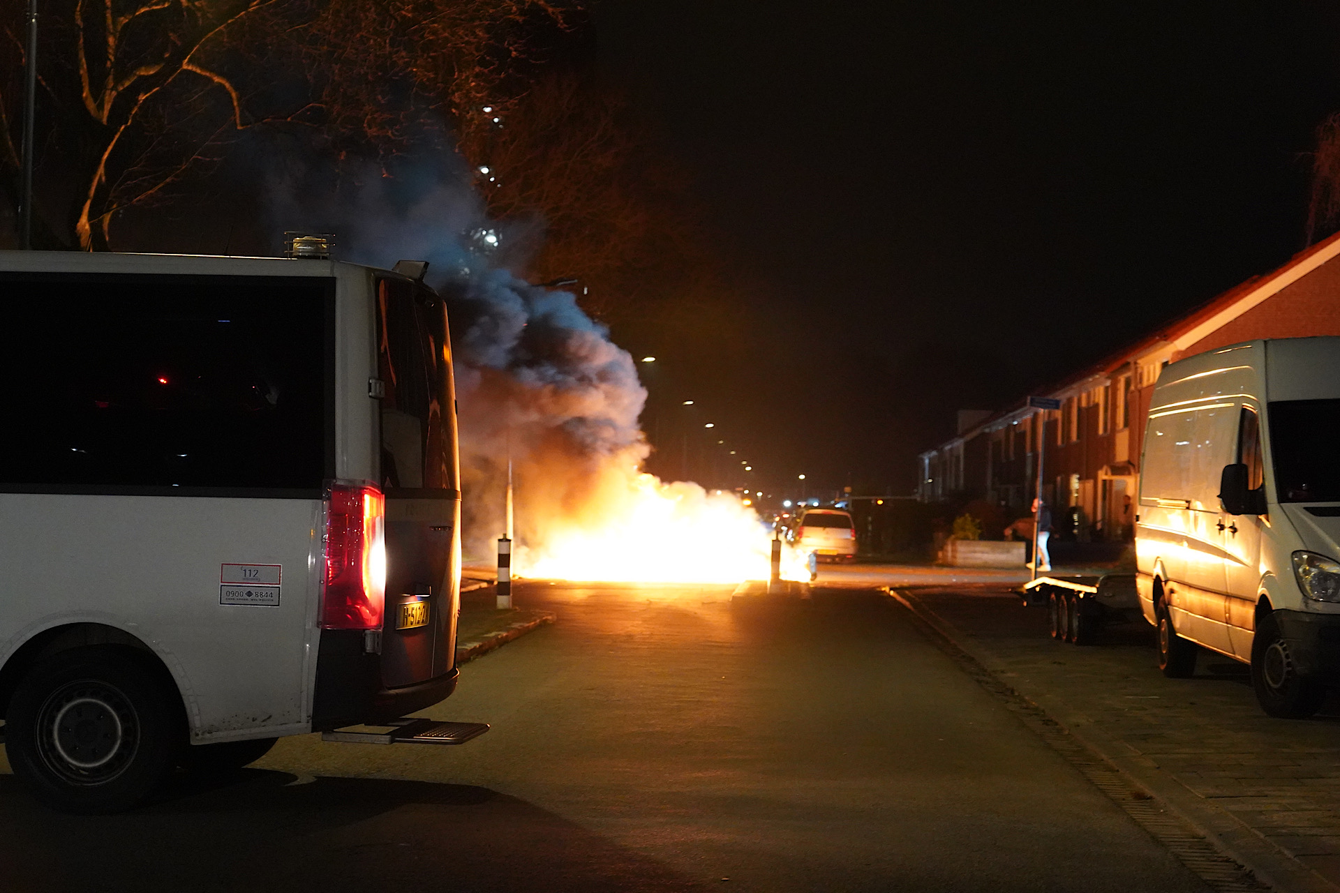 De brandweer kon onder toeziend oog van tien ME busjes de brand blussen.