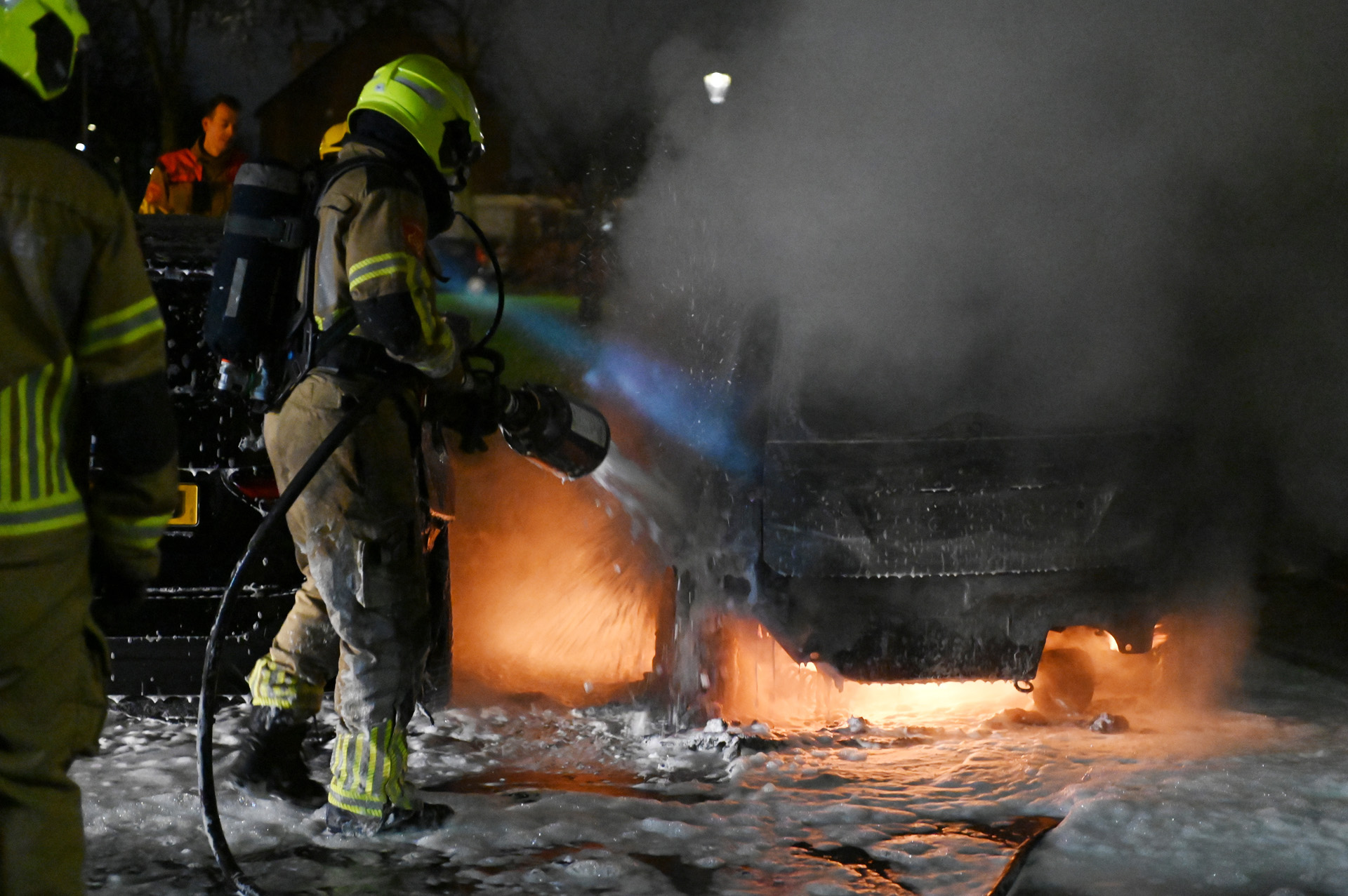 De brand begon in de middelste auto en sloeg door de hitte over naar twee naastgelegen voertuigen. Vanwege een gescheurde benzinetank werd de brand met schuim geblust.