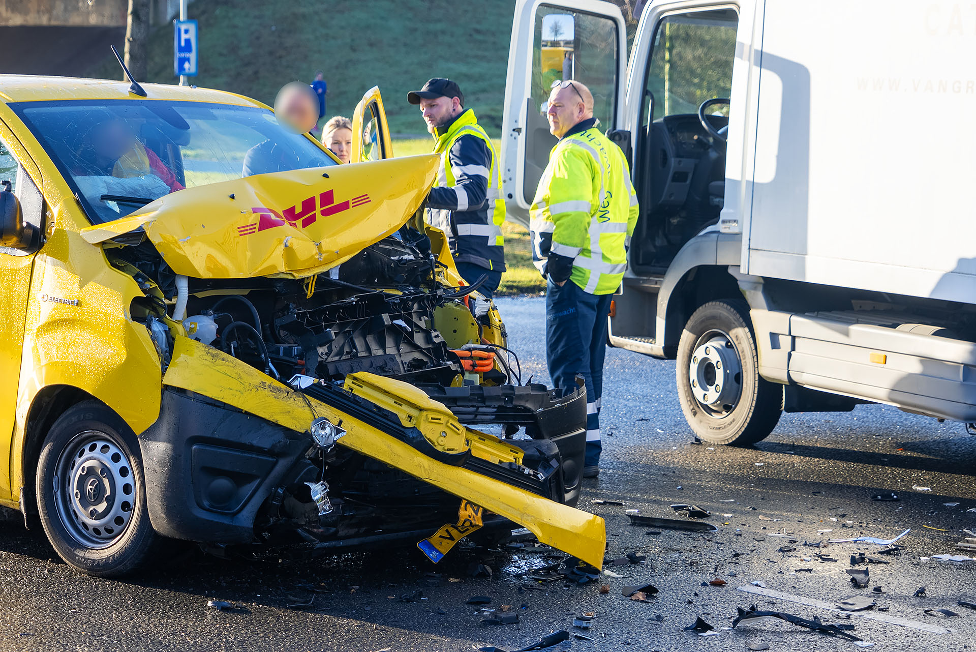 Pakketbezorger rijdt door rood en botst tegen vrachtwagen