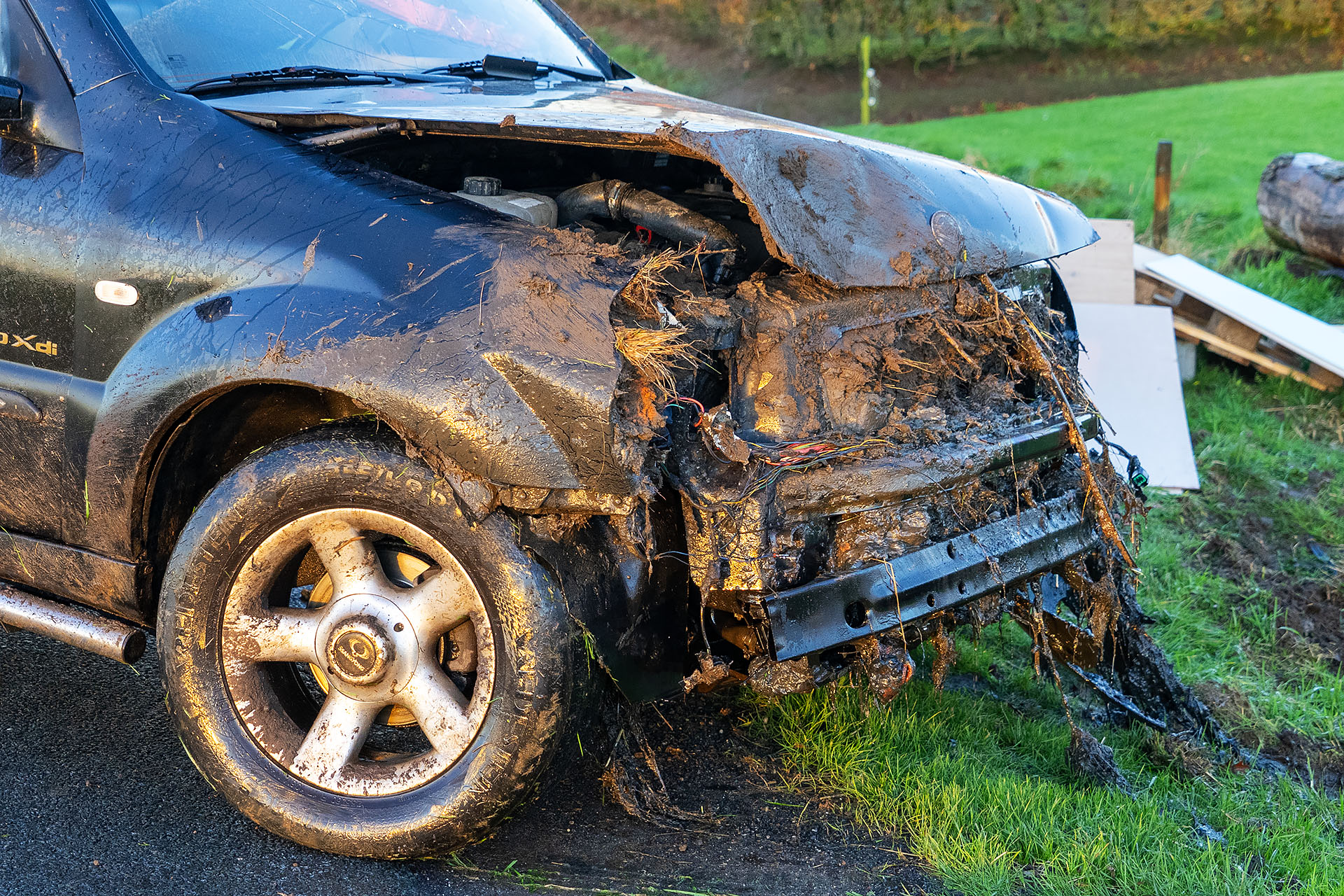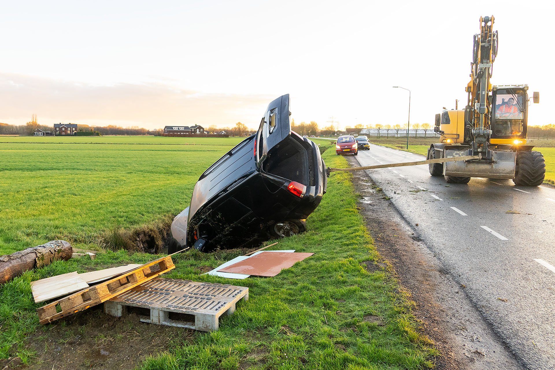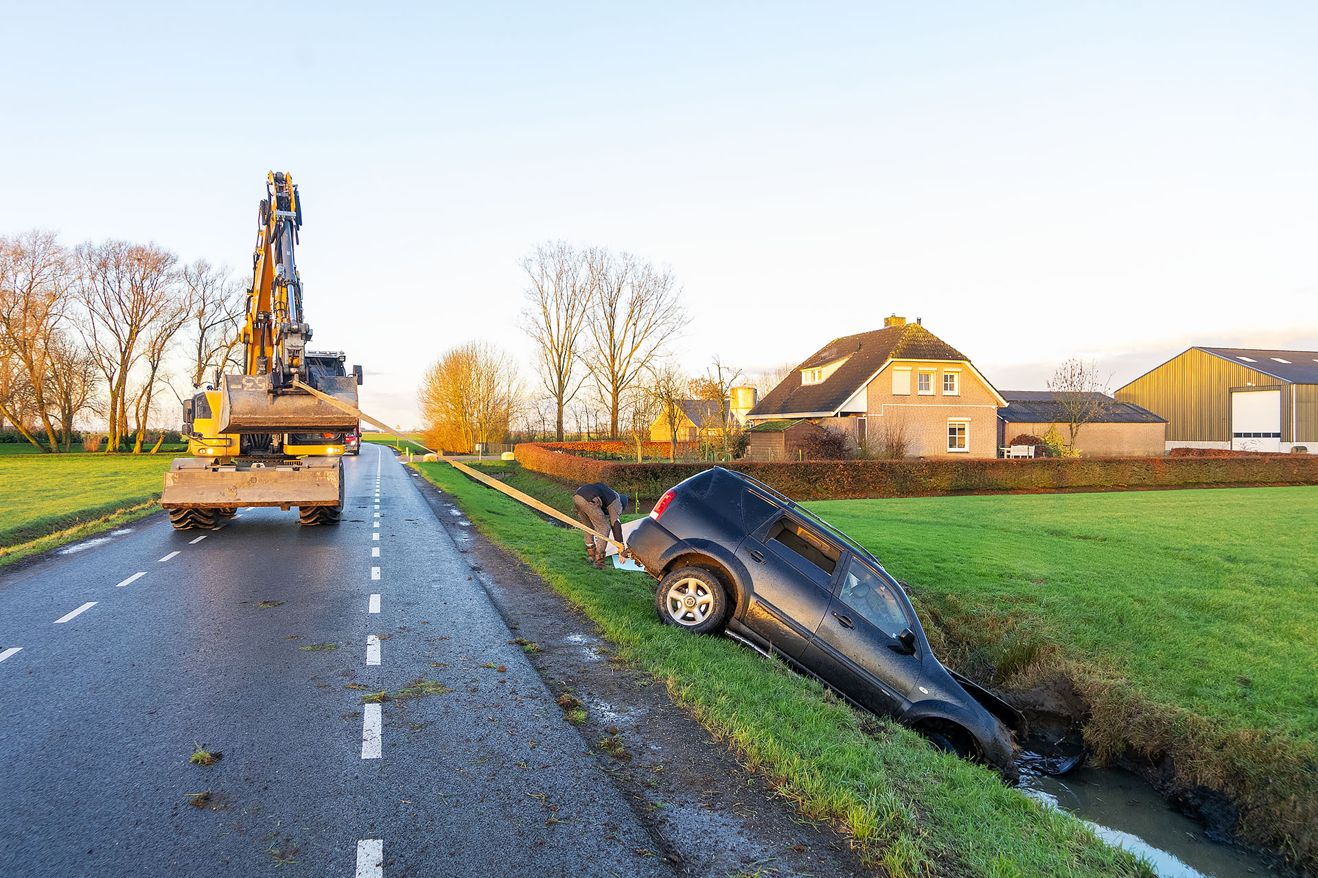 Een ondernemer heeft de auto met een graafmachine uit de sloot getrokken. De bestuurder reed daarna stapvoets naar huis met zijn beschadigde voertuig. De politie is niet ter plaatse geweest.