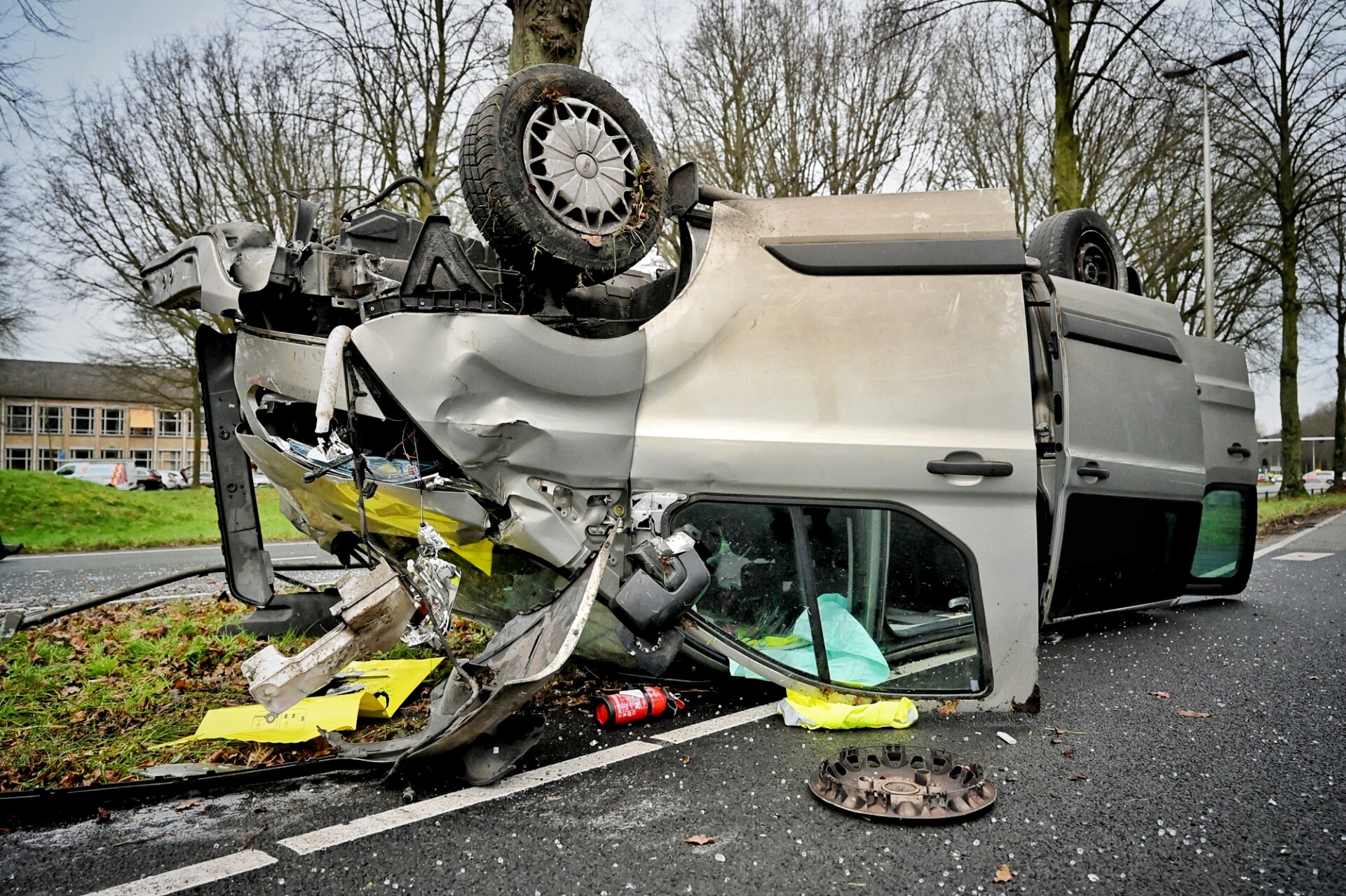 Bestelbus belandt op de kop bij ongeval, bestuurder door omstanders bevrijd