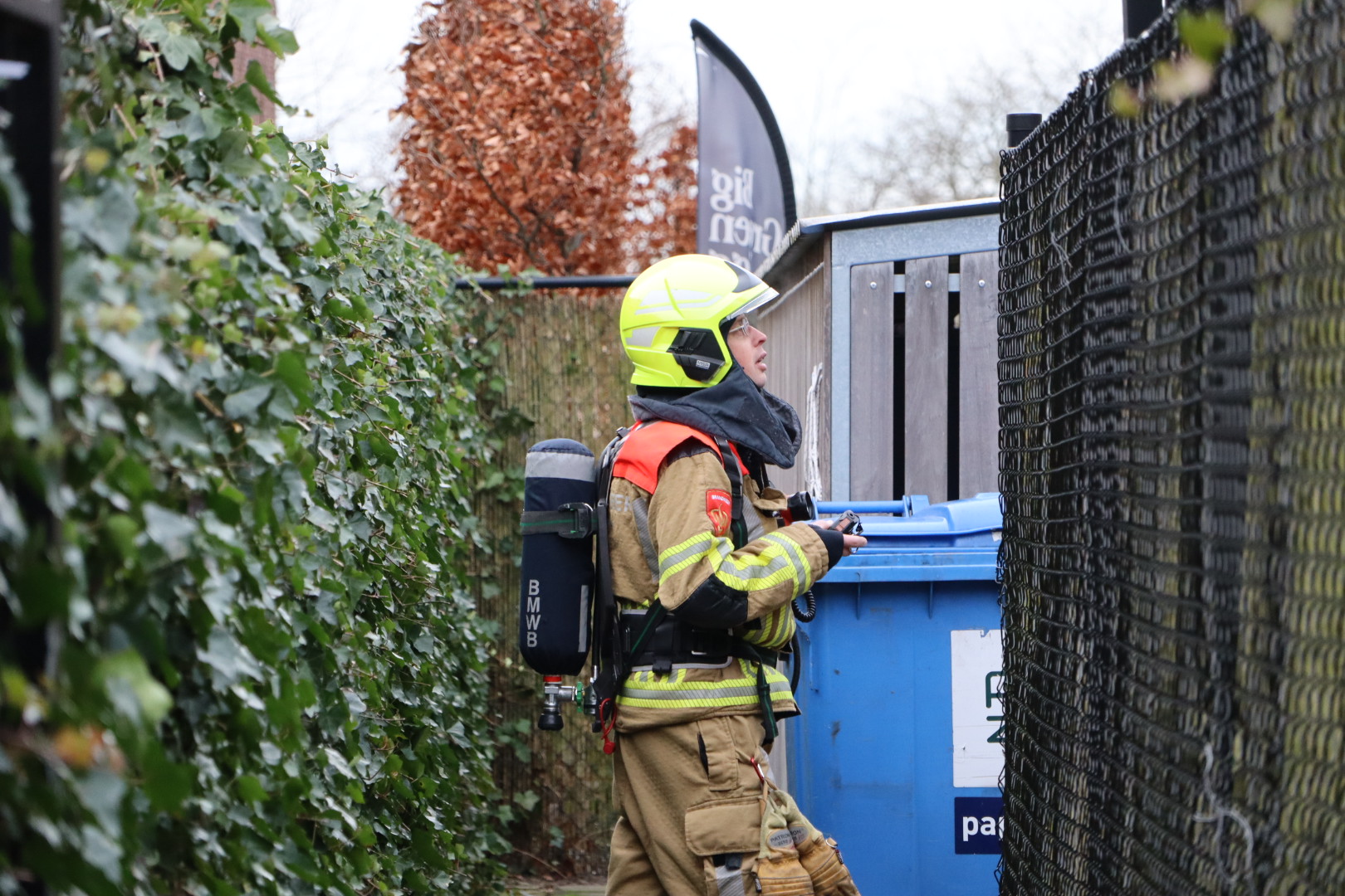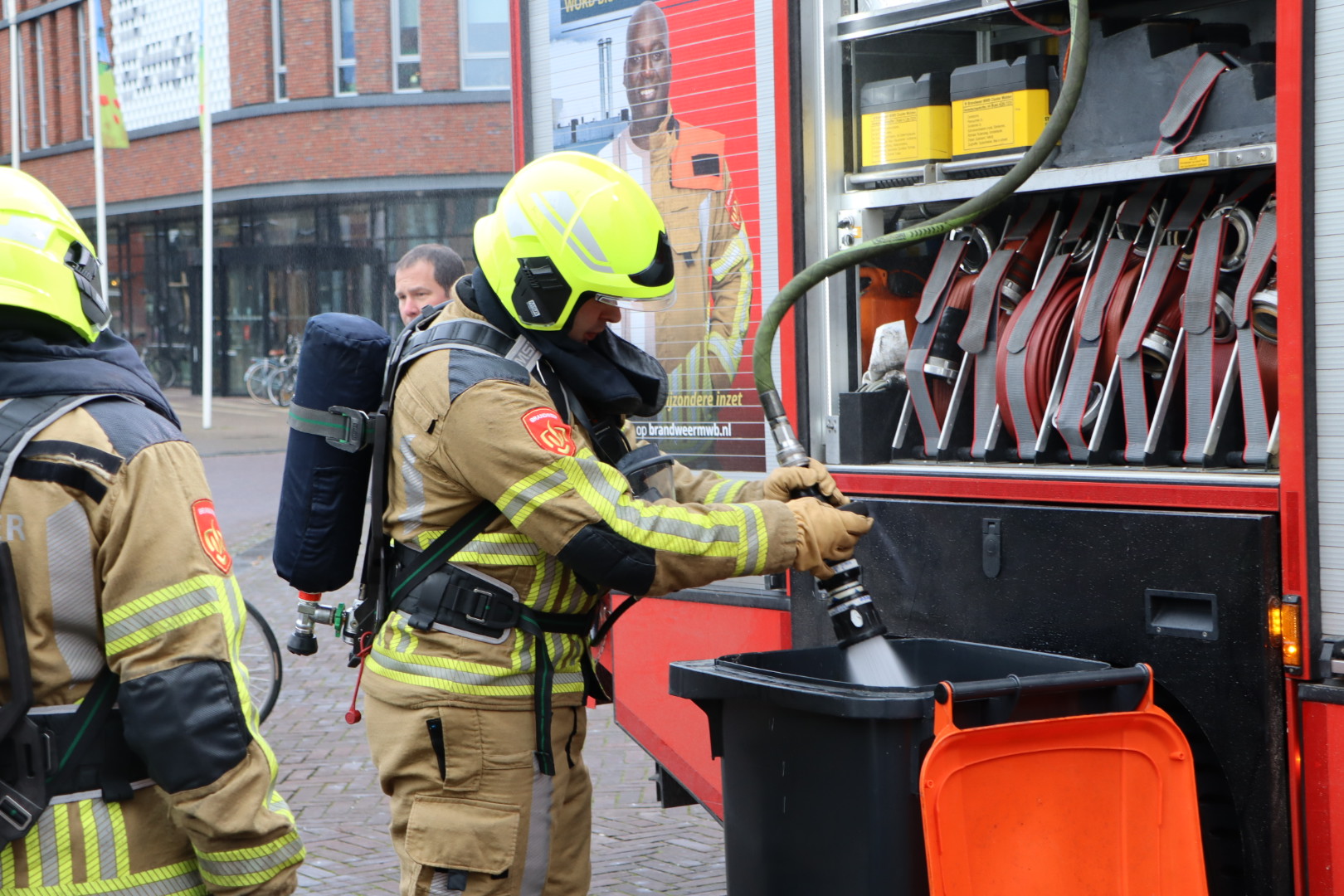 Een van de accu’s had vlam gevat. De brandweer zette een vuilcontainer vol water in om de accu veilig te laten afkoelen.