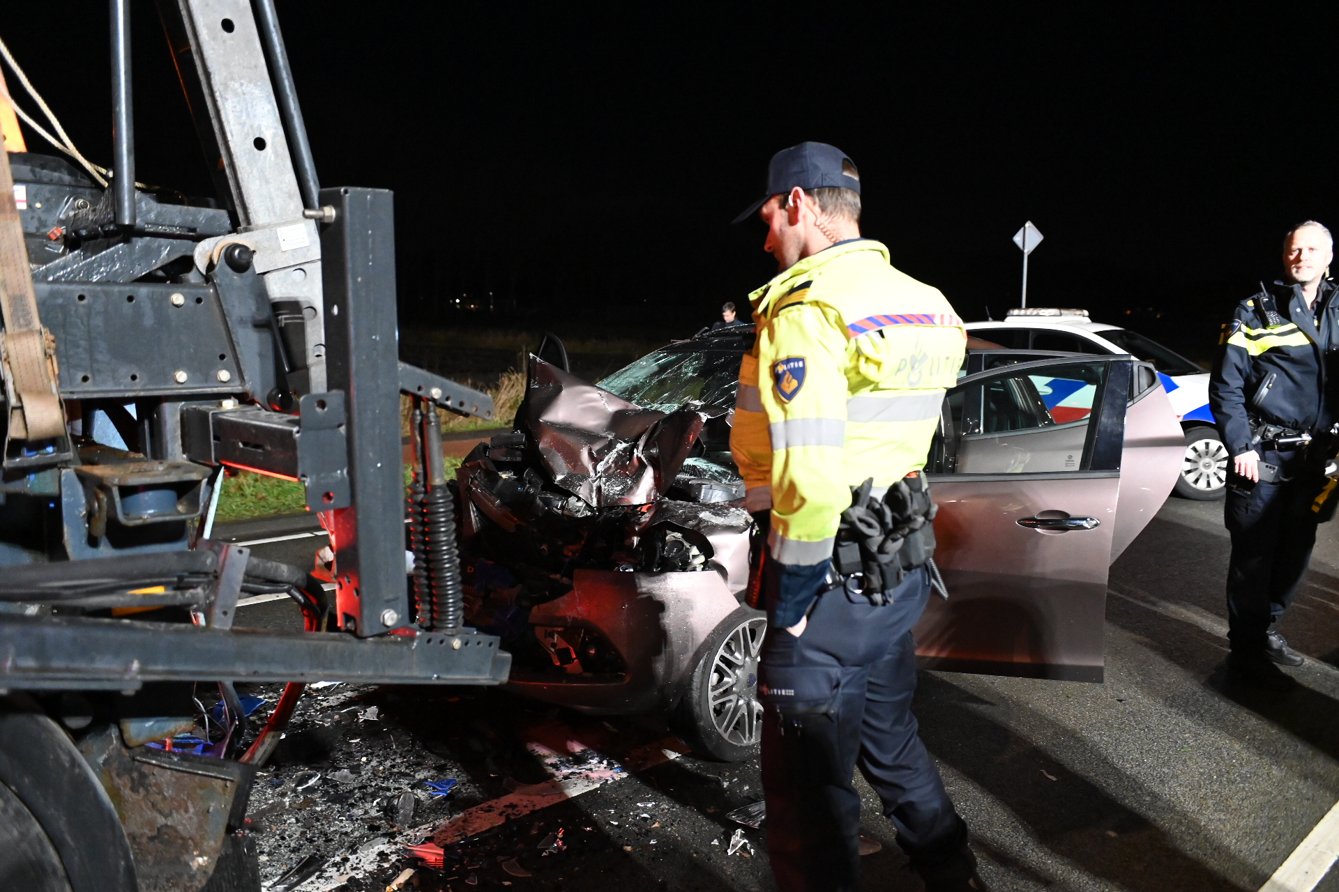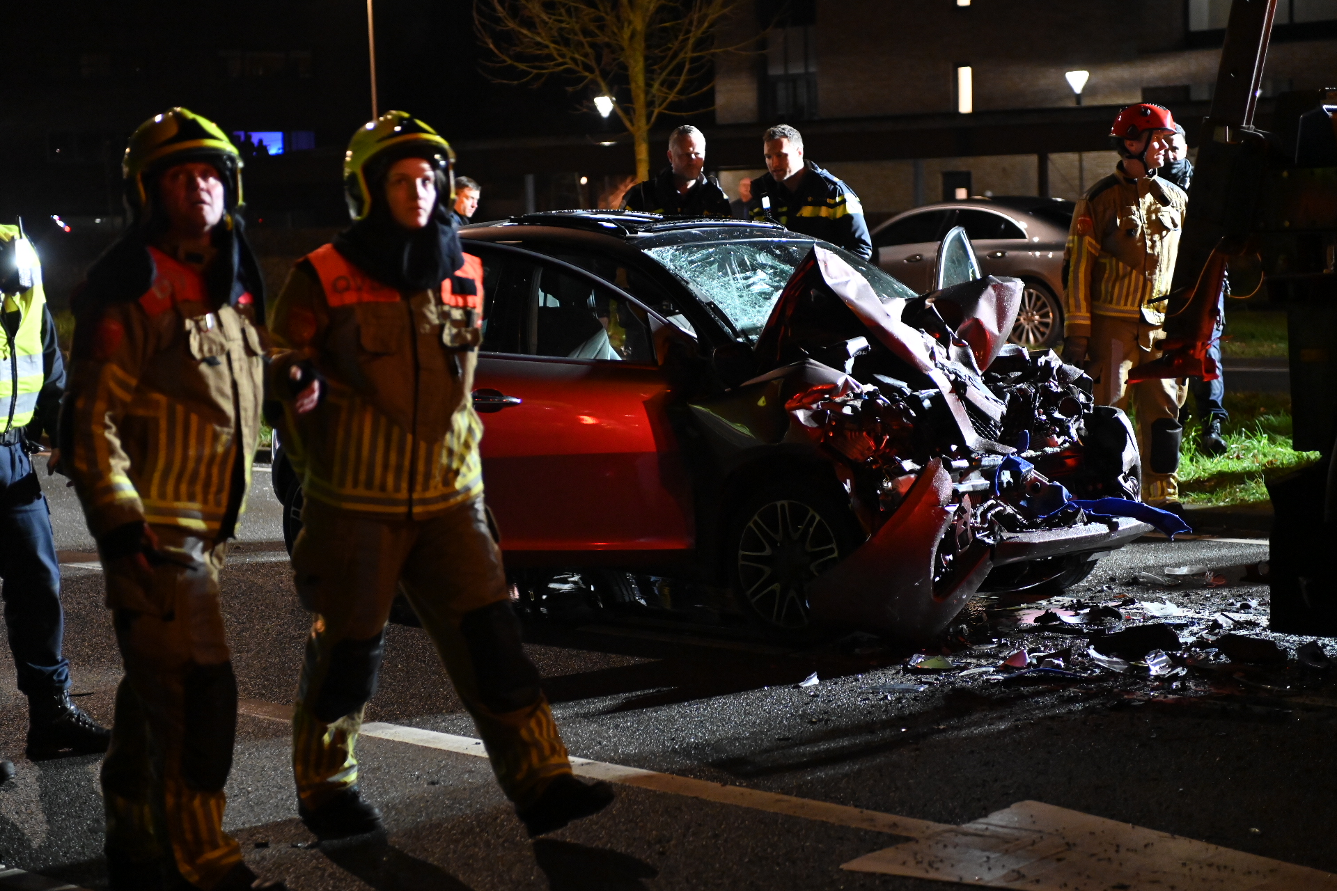 Twee personen raakten zwaargewond, en de auto liep zware schade op. Een traumahelikopter, meerdere ambulances en de brandweer kwamen ter plaatse.