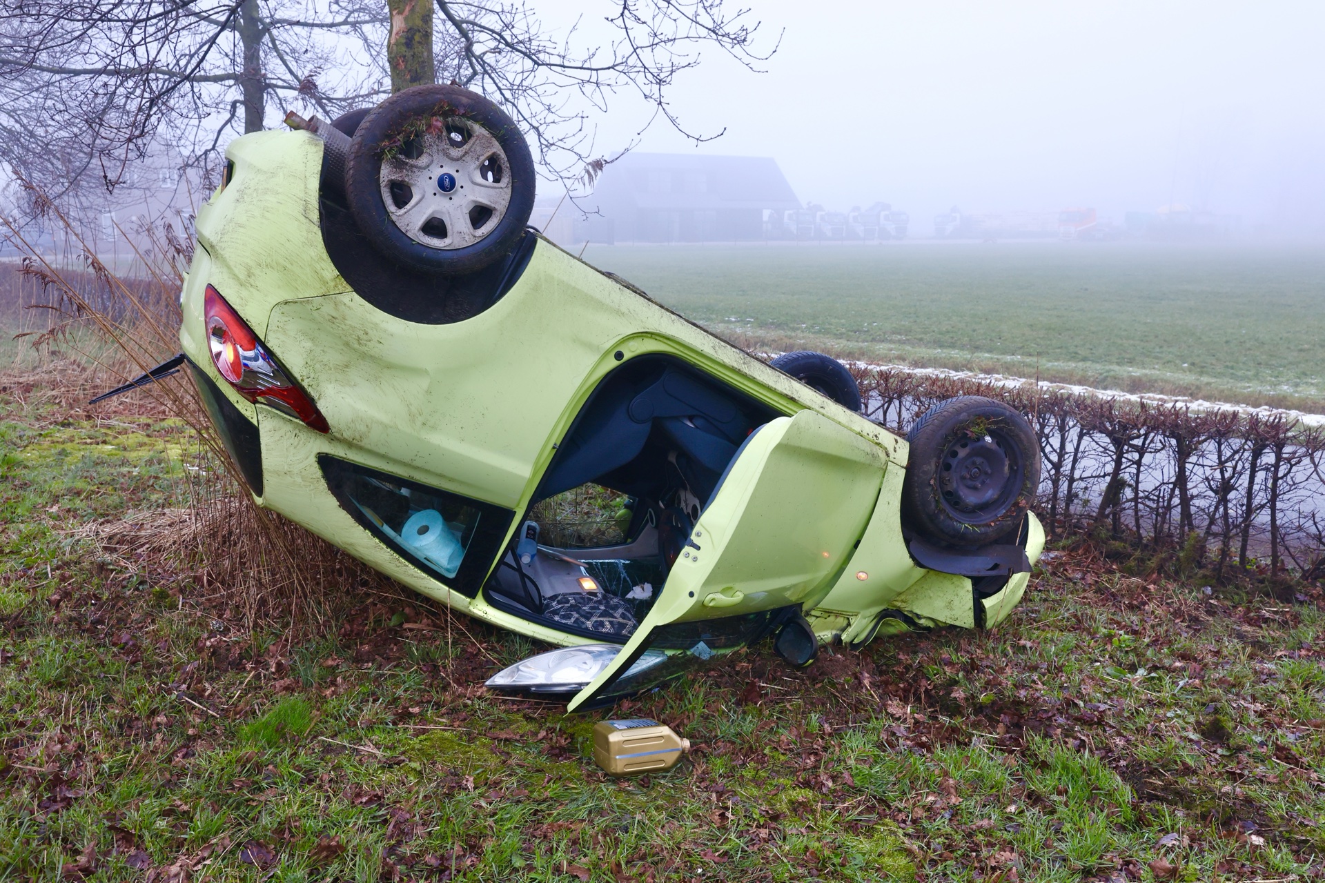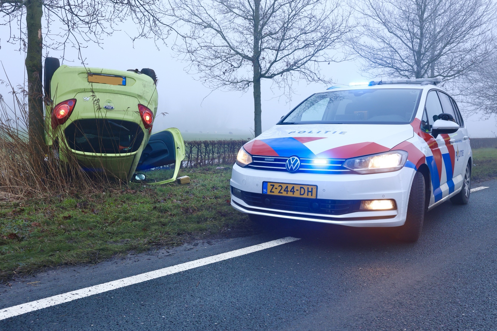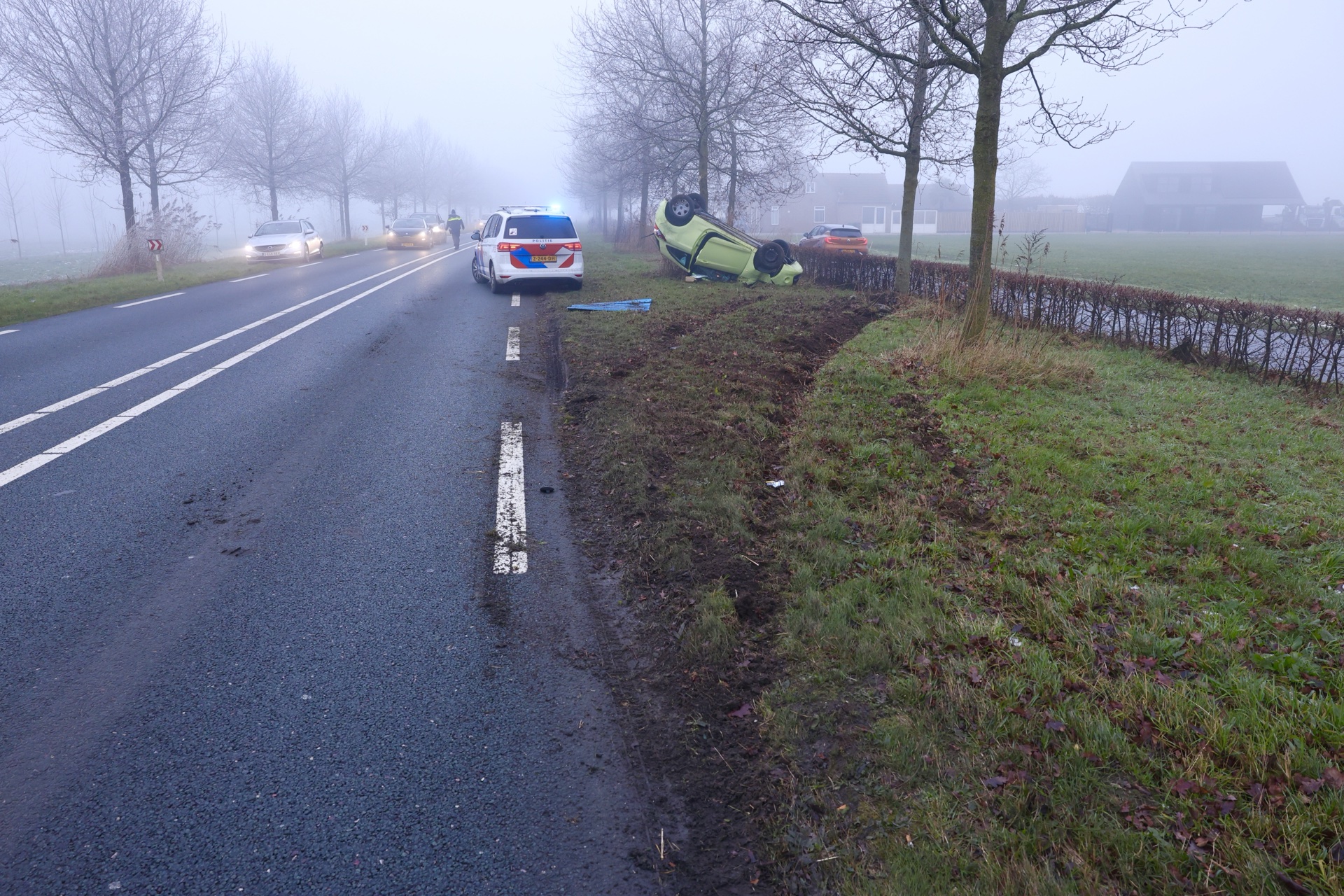 Een bergingsbedrijf sleept het voertuig weg, en de politie regelt het verkeer. Of mist een rol speelde, is niet bekend.