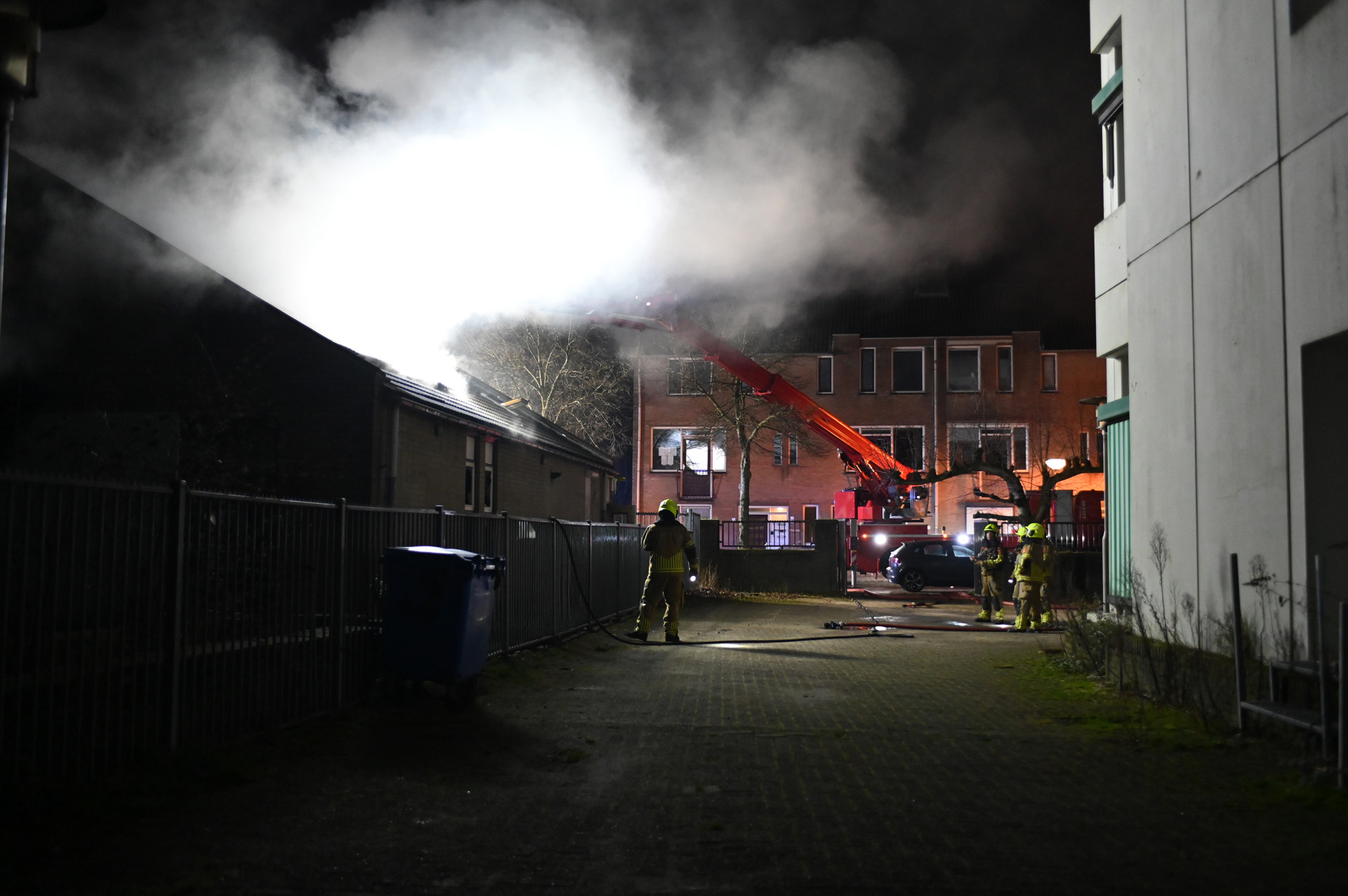 De brandweer is met twee tankautospuiten en een hoogwerker ter plaatse om het vuur te bestrijden.