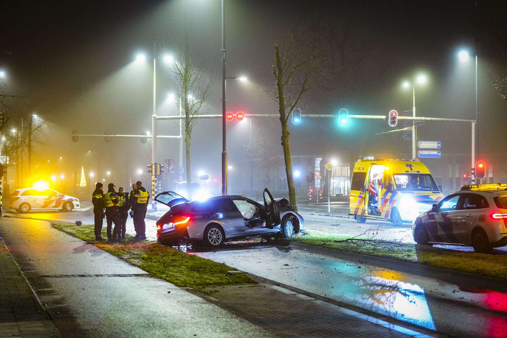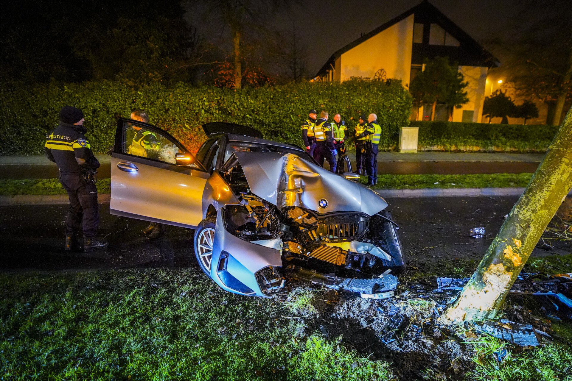 Op de Aalsterweg verloor de bestuurder bij bushalte Kortonjo de macht over het stuur en ramde twee bomen, die volledig afbraken. Het voertuig kwam 100 meter verder tot stilstand tegen een andere boom op de Floralaan West. De schade was enorm.