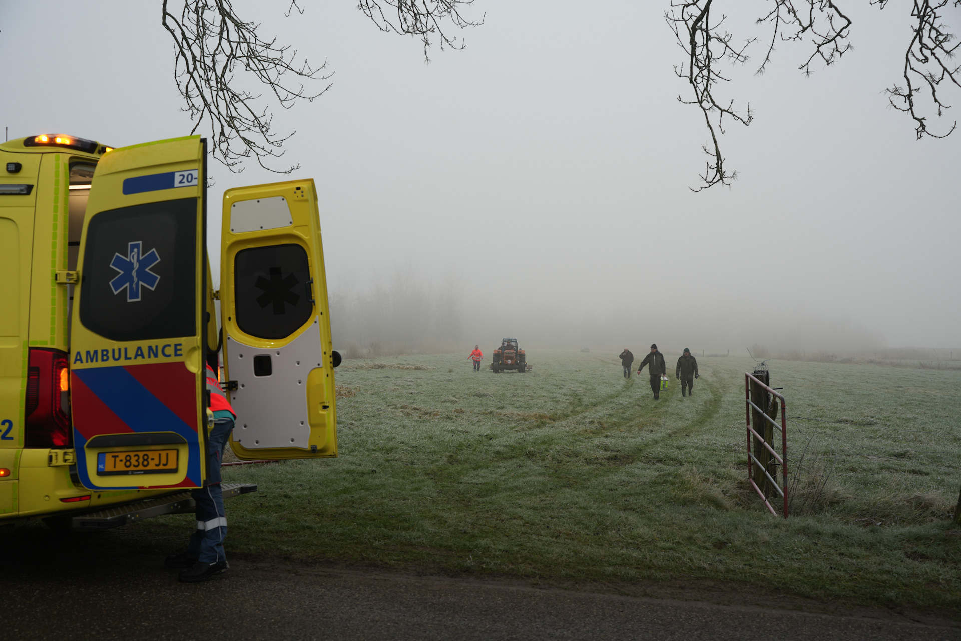 De man is naar het ziekenhuis gebracht. De tractor heeft vervolgens ook de vastzittende auto uit het weiland getrokken.
