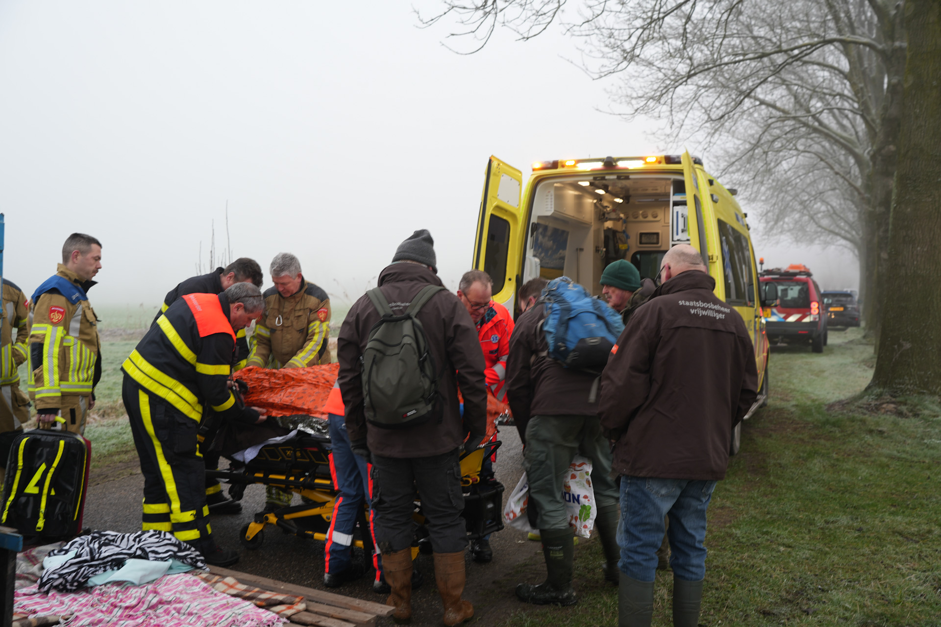 De man was met vrijwilligers bezig bomen te zagen toen hij onwel werd en in een sloot belandde. Collega’s hielpen hem uit de sloot en belden een ambulance. Omdat de ambulance het drassige weiland niet kon bereiken, werd een collega’s auto ingezet, maar deze kwam vast te zitten. Een tractor van een collega van Staatsbosbeheer bracht uiteindelijk uitkomst. Met een pallet, dekens en de patiënt achterop de tractor werd de man naar de weg gebracht, waar de brandweer net arriveerde om hem op een brancard te leggen en naar de ambulance te vervoeren.
