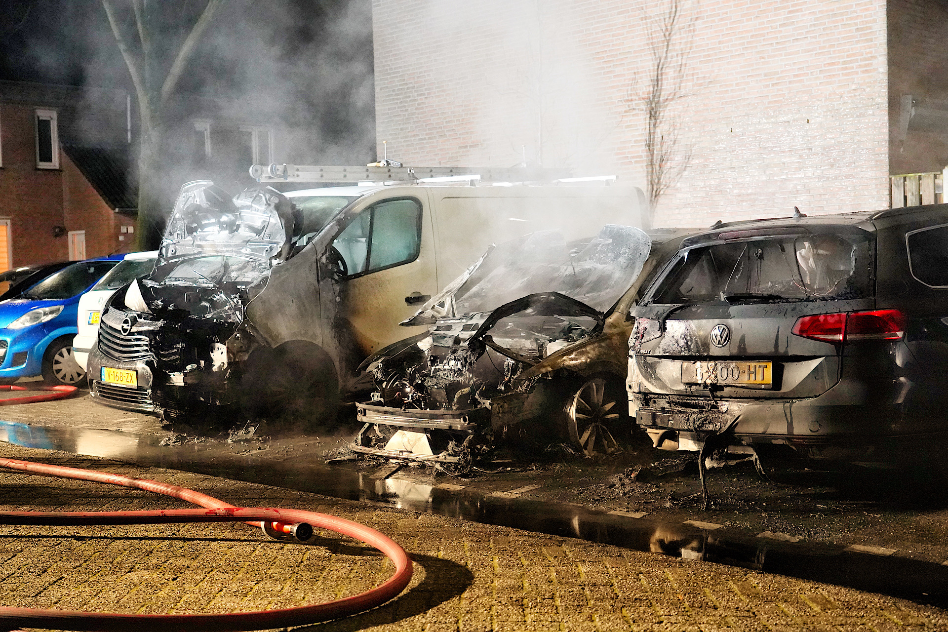 Twee auto’s en bestelbus uitgebrand, politie onderzoekt brandstichting