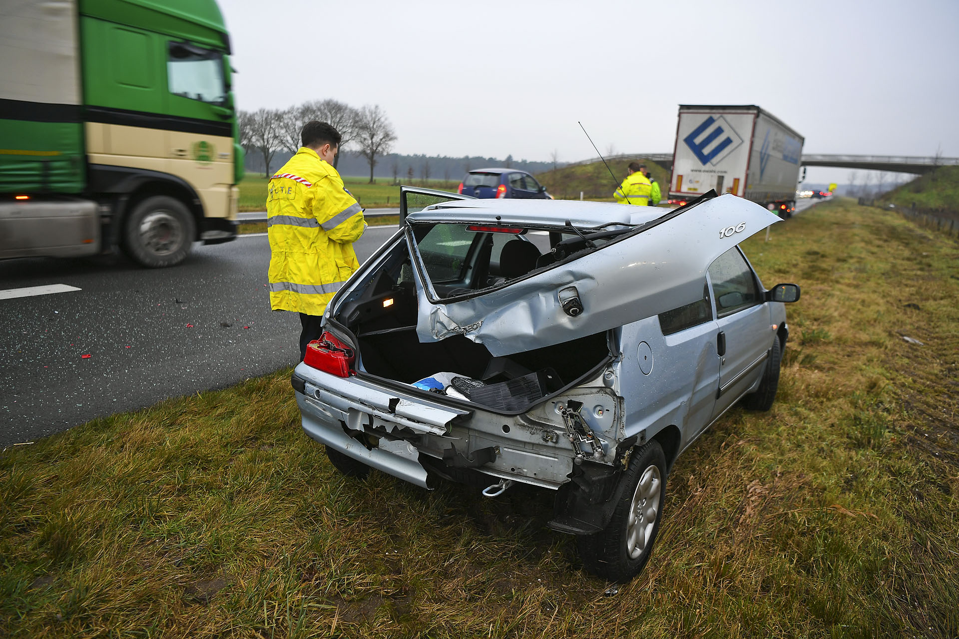 De vrouw bleef ongedeerd en werd kort nagekeken door een passerende verpleegster. Het verkeer kon langs het ongeval doorrijden, en de beschadigde auto wordt afgevoerd.