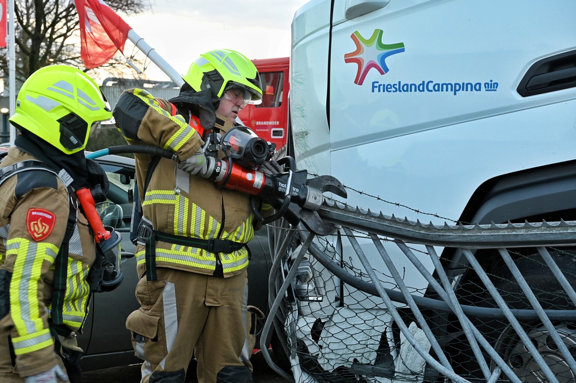 De vrachtwagen raakte eerst een lantaarnpaal in de berm, kwam op de tegenovergestelde weghelft terecht en botste vervolgens tegen een hekwerk en drie geparkeerde auto’s bij een bedrijf.