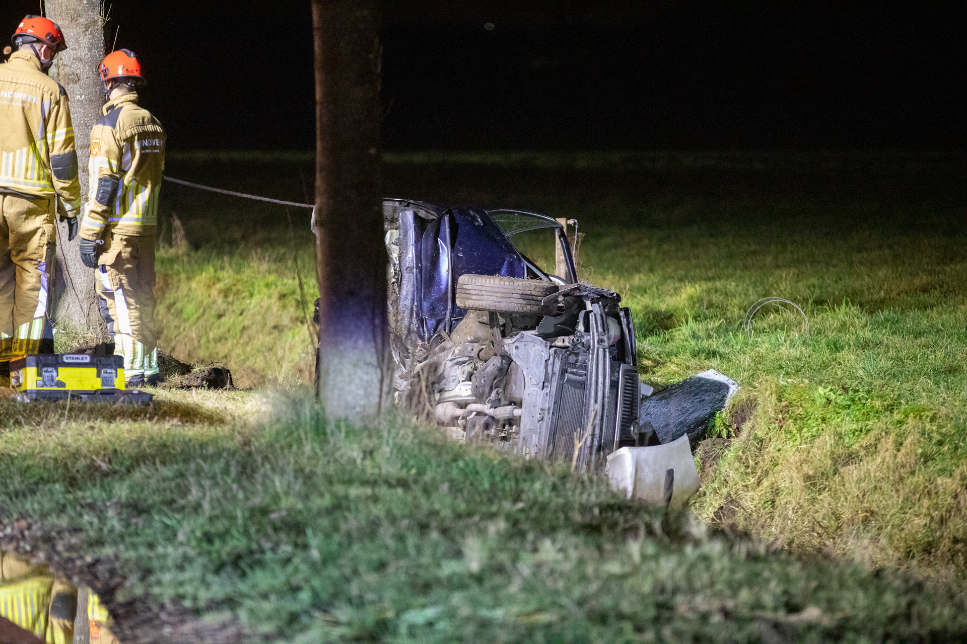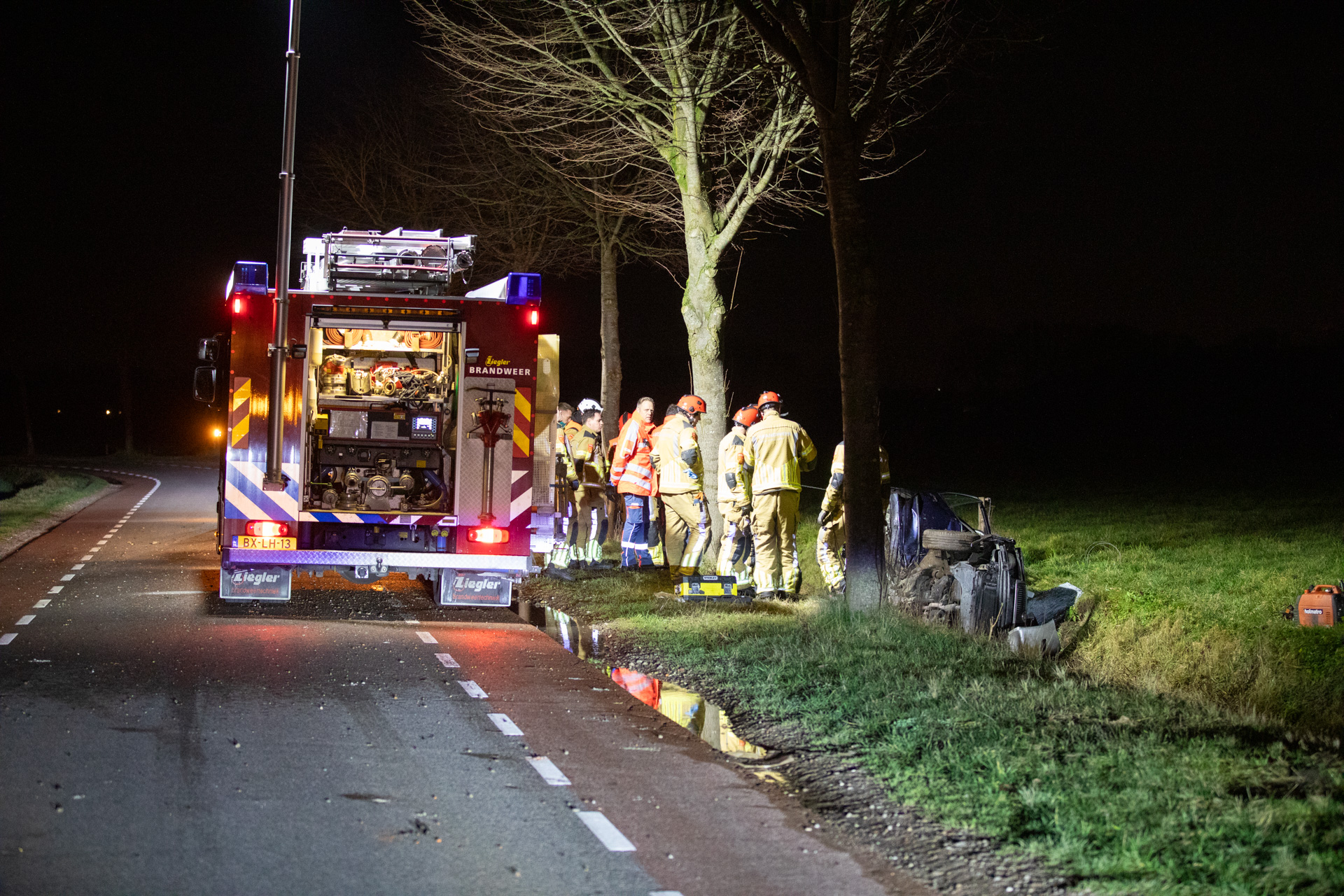 De vrouw raakte om onbekende reden van de weg, waarna haar auto in een sloot belandde en op de zijkant terechtkwam. Ze zat bekneld in het voertuig.