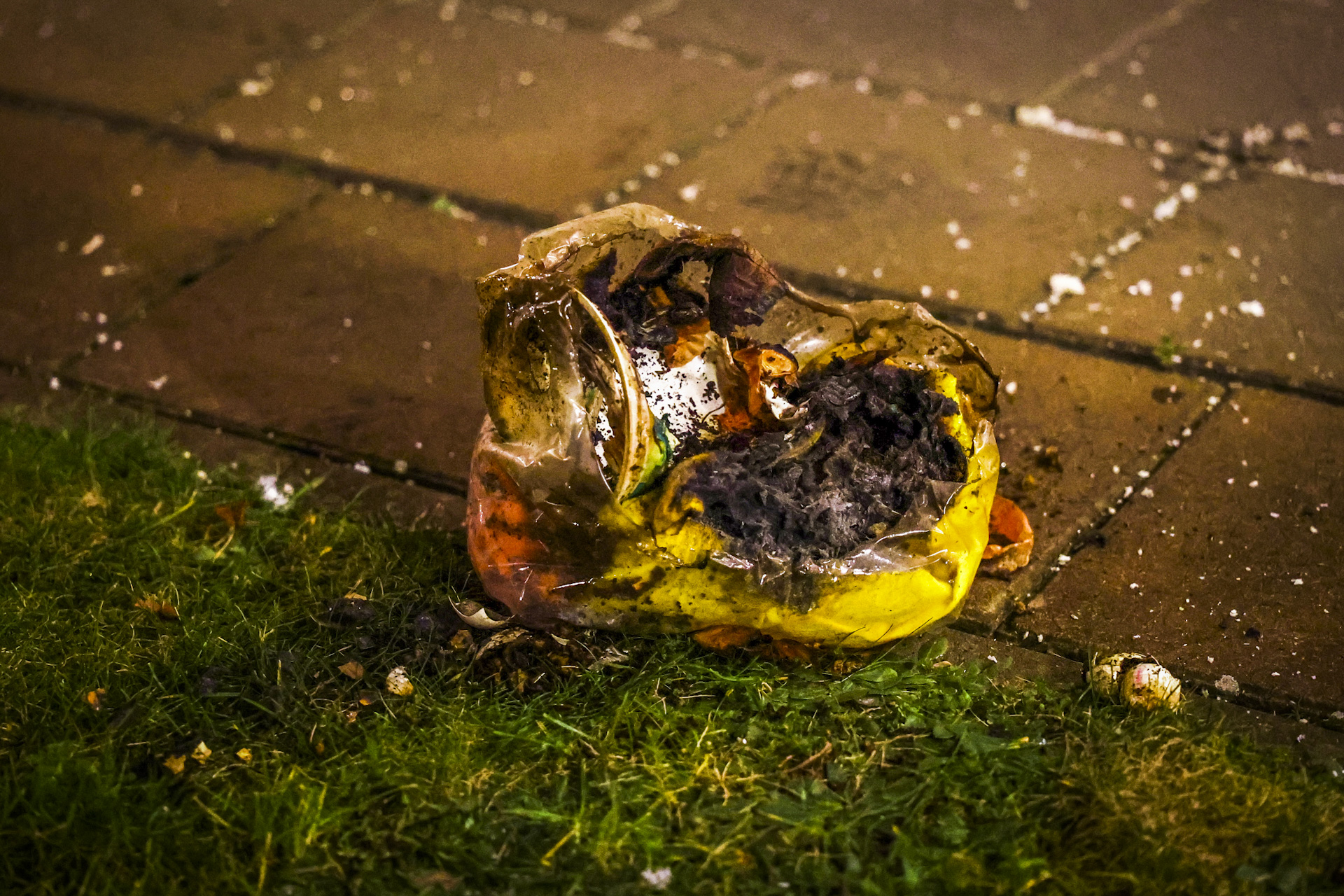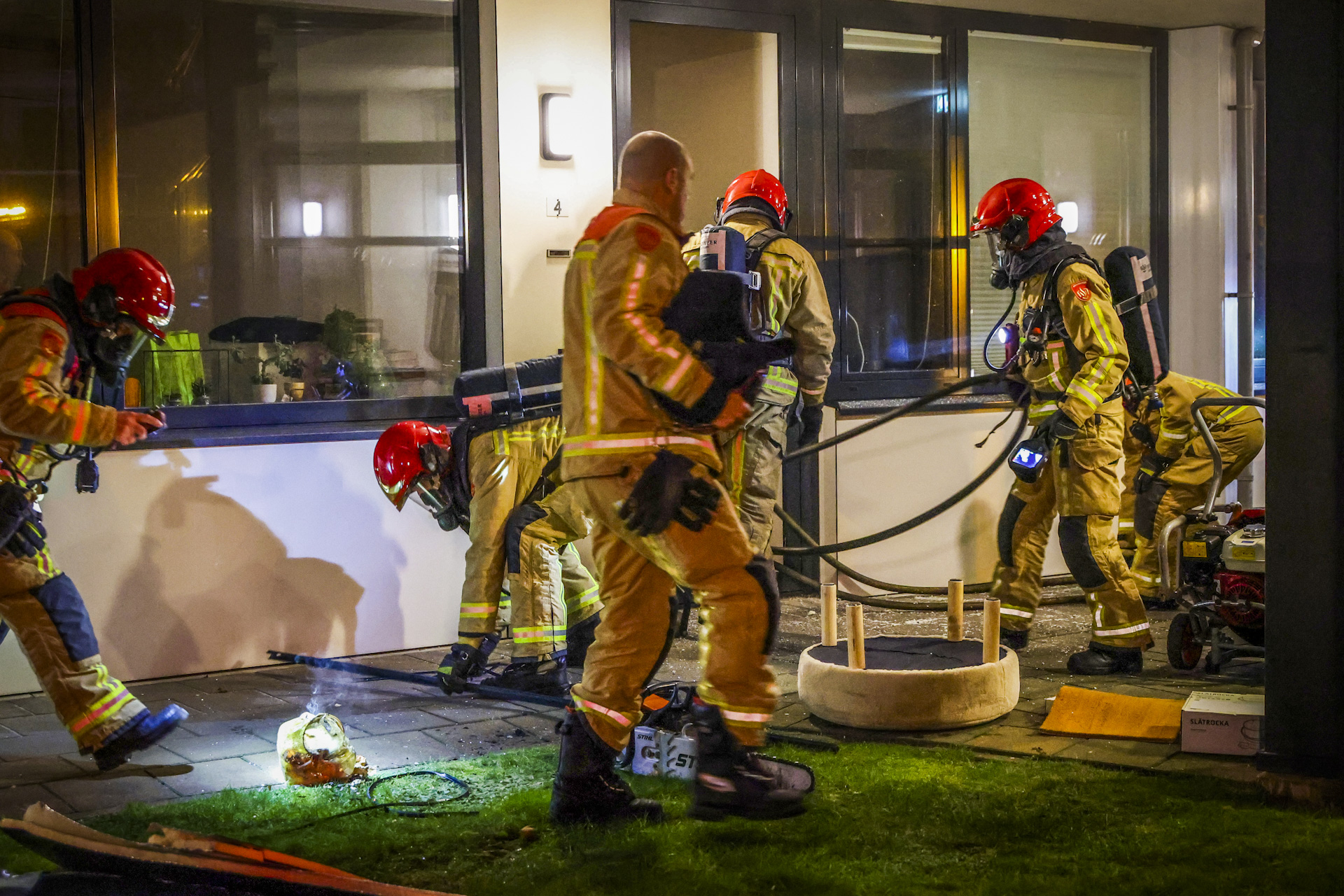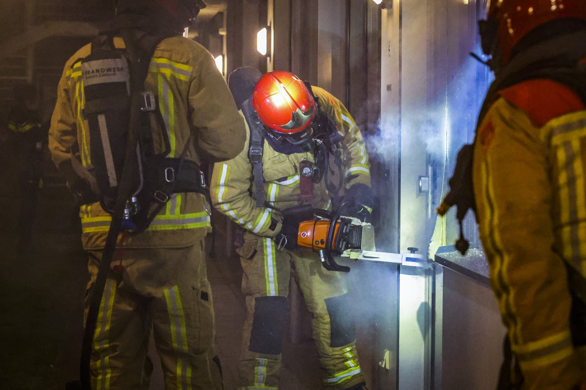 Omdat bellen en kloppen geen reactie opleverde en de rook dikker werd, zaagde de brandweer de voordeur open. Binnen bleek een brandende vuilniszak met etensresten de oorzaak. Er was niemand aanwezig.