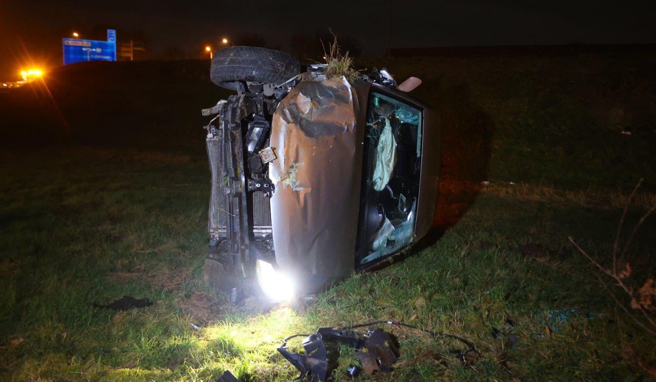 Een bergingsbedrijf heeft de auto weer op zijn wielen gezet en afgevoerd. De toerit naar de A2 was tijdelijk afgesloten. De brandweer hoefde niet in actie te komen.