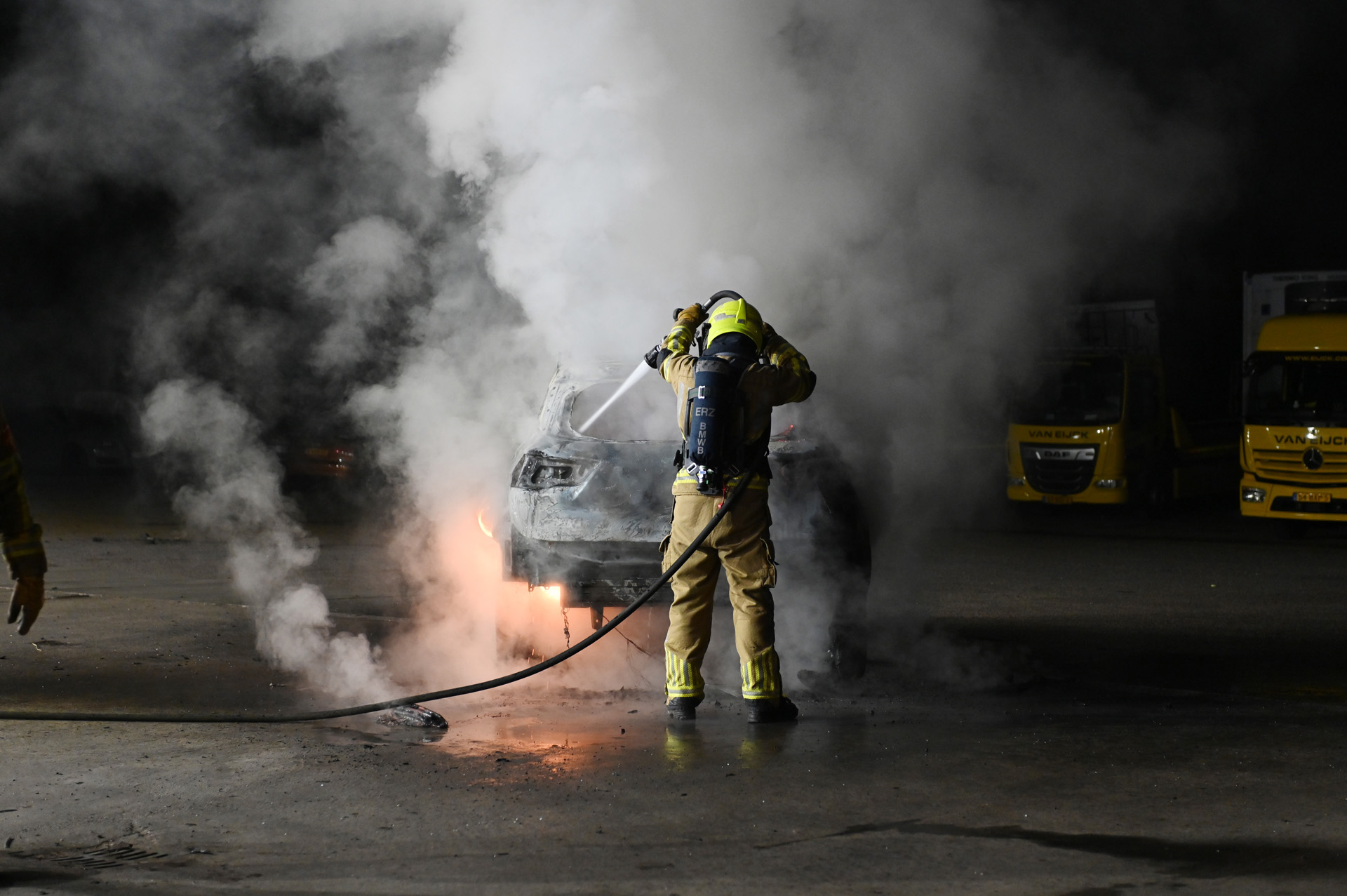 BREDA – In de nacht van zaterdag op zondag is een elektrische auto opnieuw in brand gevlogen op het terrein van een berger aan de Graaf Engelbertlaan.