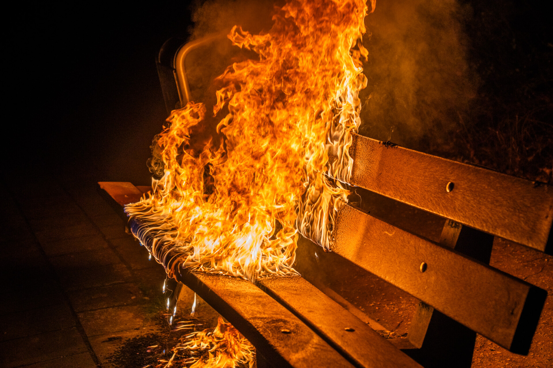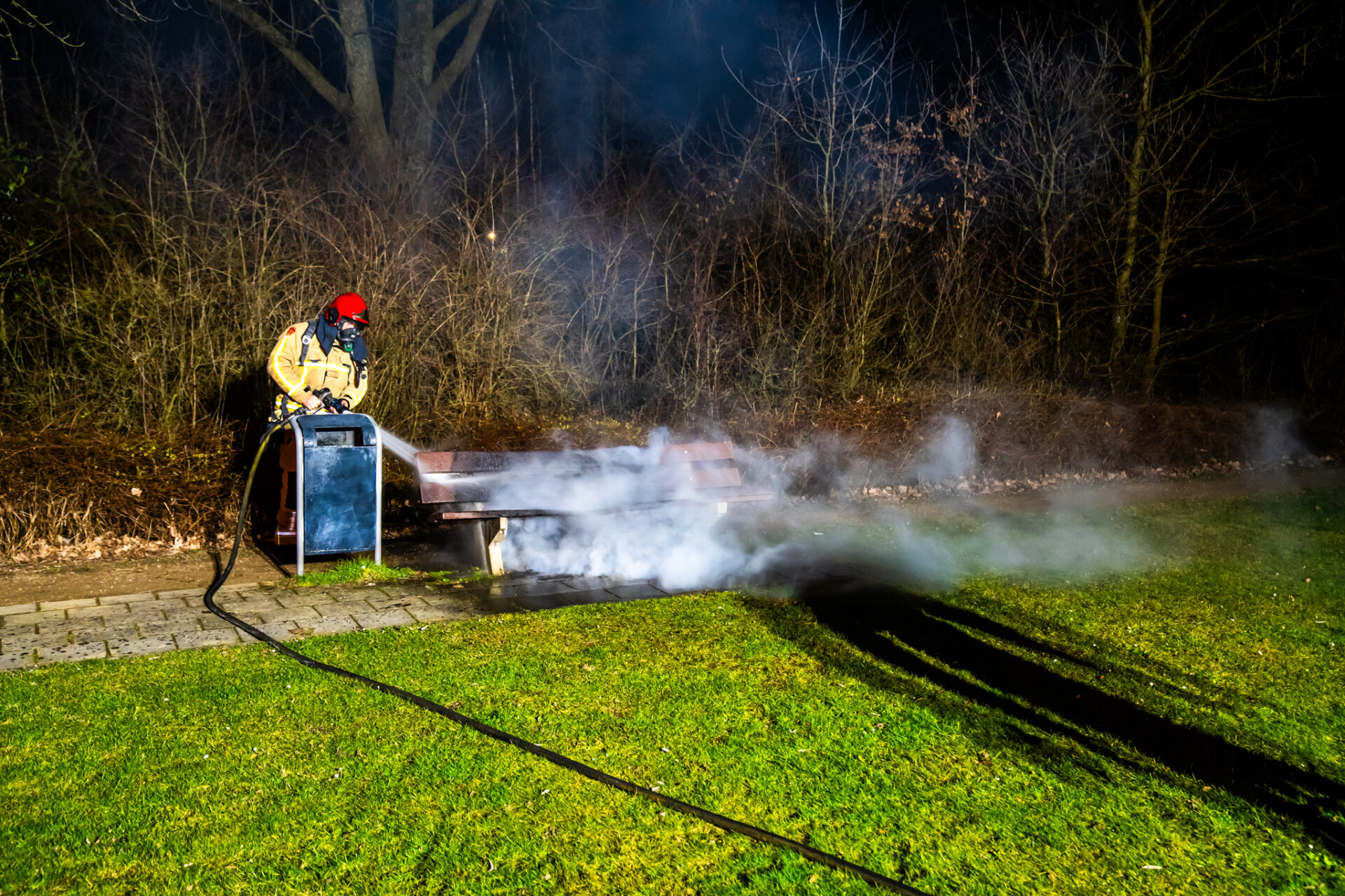 Ter plaatse troffen brandweerlieden een brandend bankje aan, dat met een straal hoge druk is geblust.