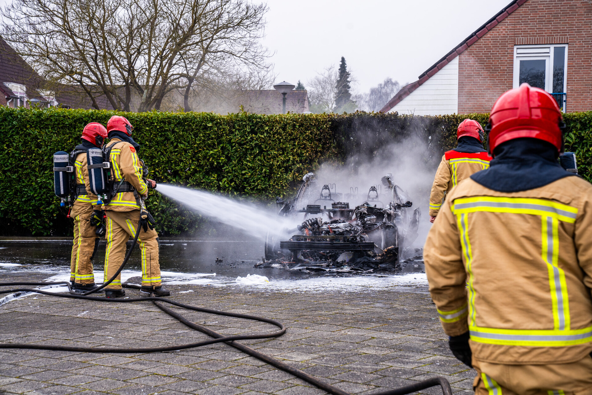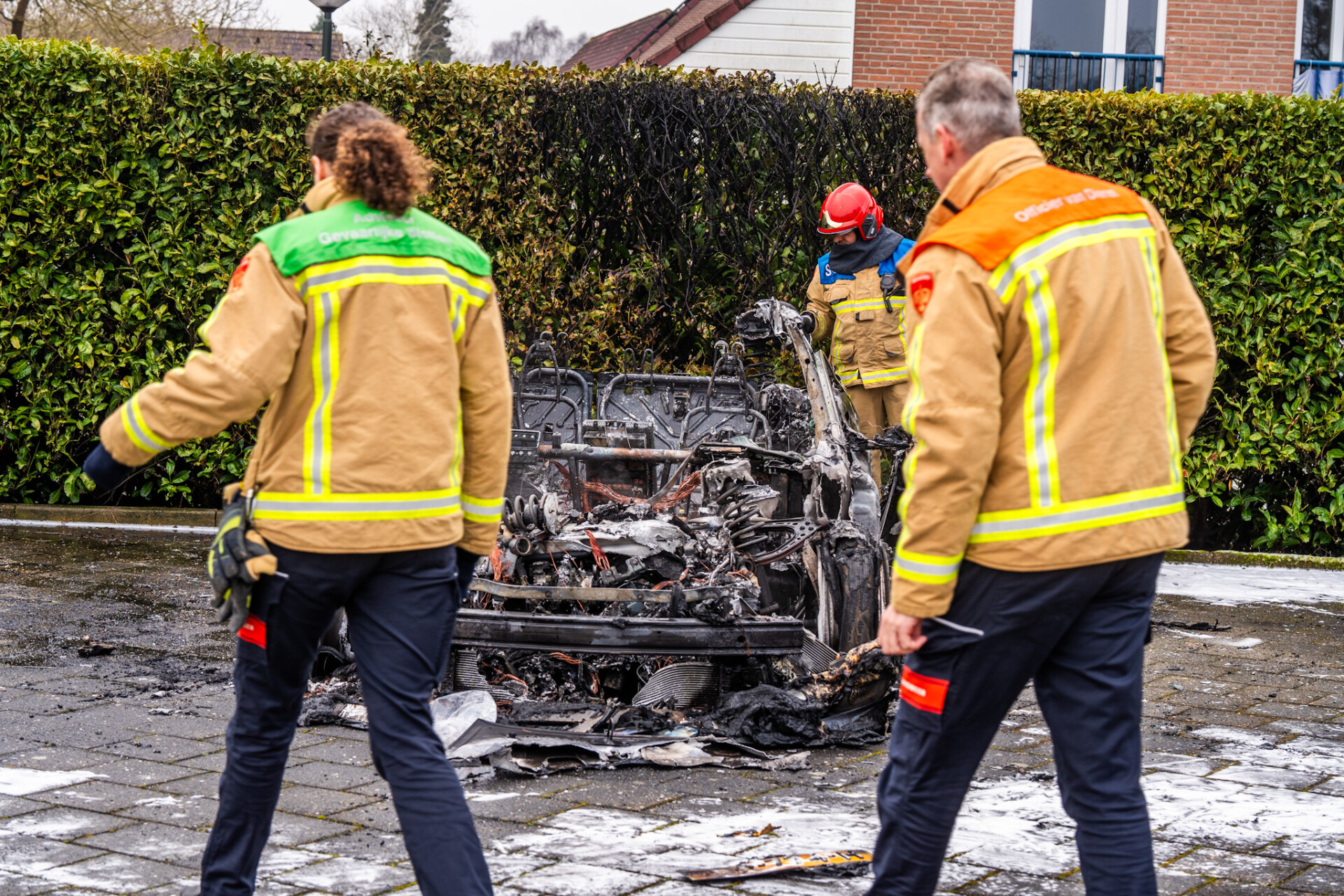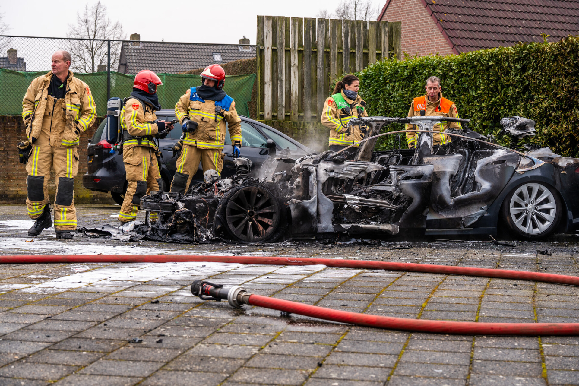 Vanwege de gevaarlijke stoffen bij een elektrische autobrand schaalde de brandweer groots op. Het vuur was snel onder controle.