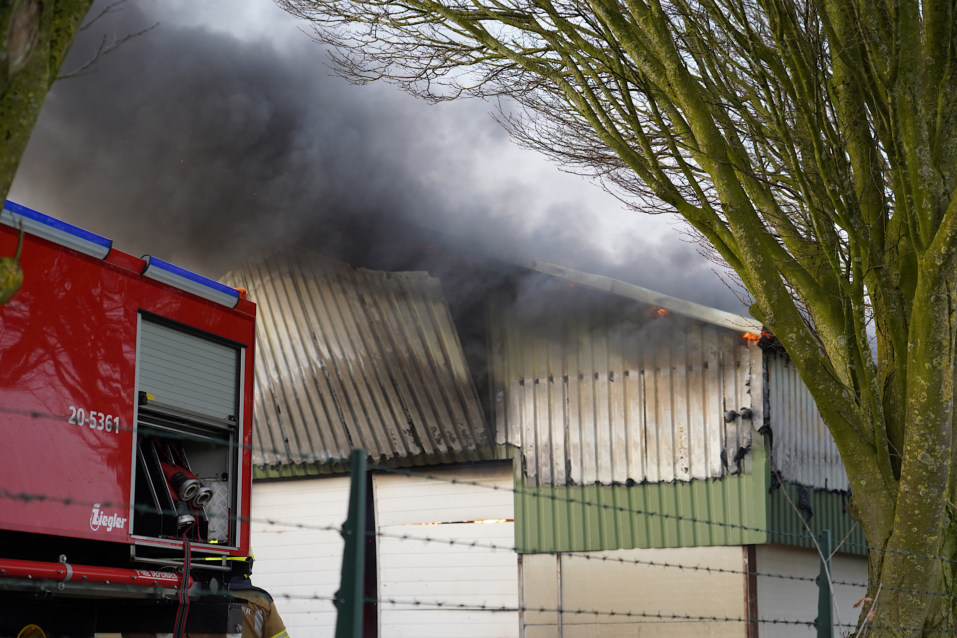 Het vuur ontstond rond 15.45 uur en werd snel opgeschaald naar middelbrand. Twee bluswagens kwamen ter plaatse en wisten overslag naar andere loodsen te voorkomen.