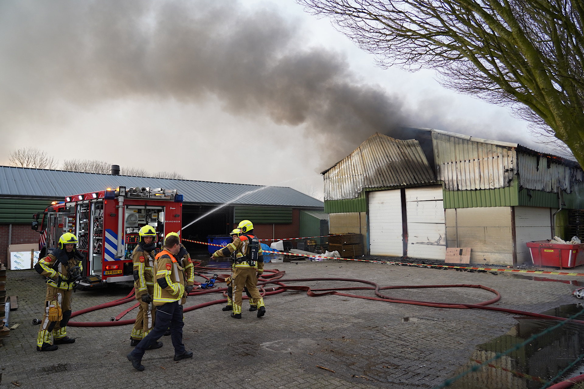 De rook was in de wijde omgeving zichtbaar. De oorzaak van de brand is nog onbekend. In de loods lagen onder meer ijzer en metaal.