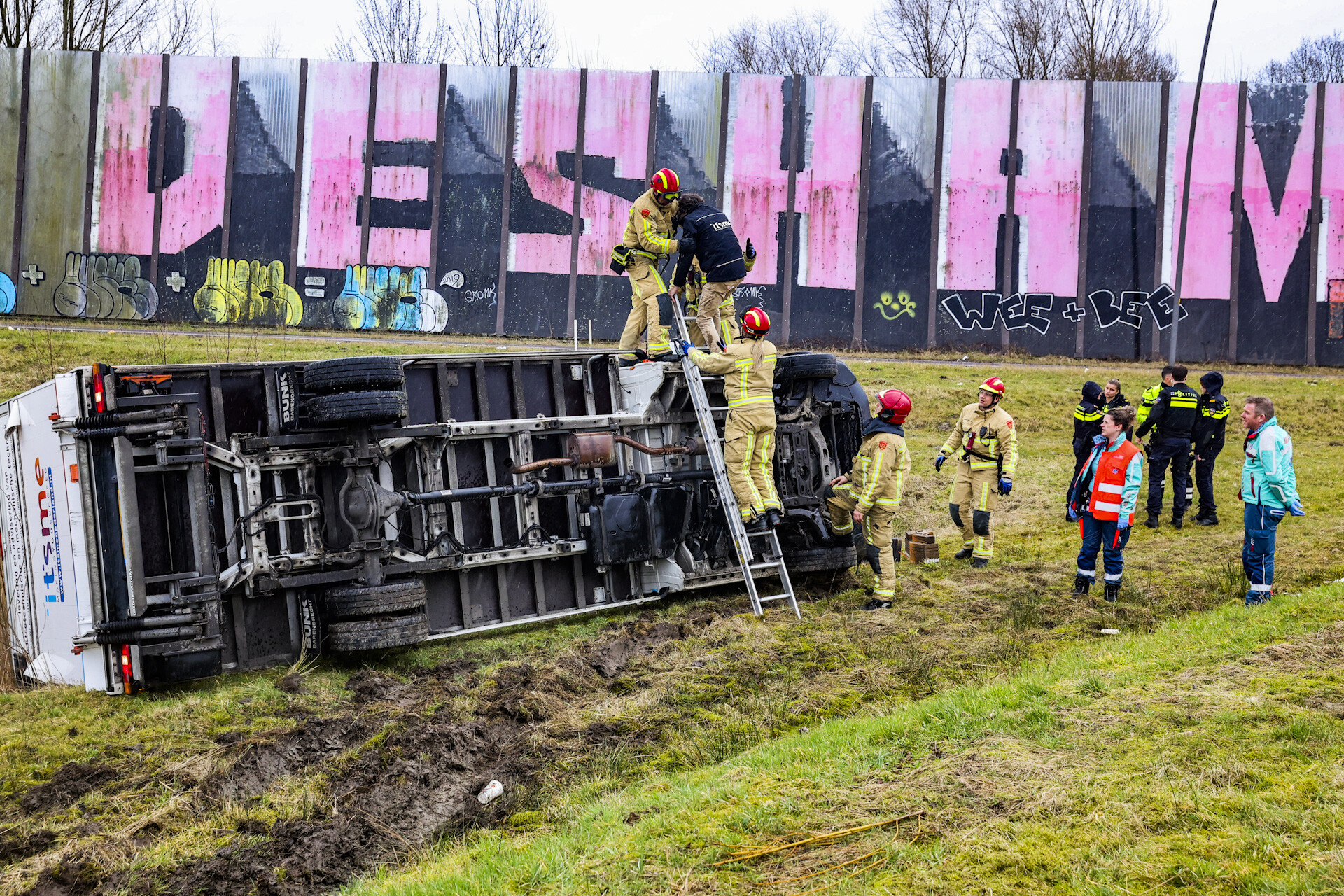 Vrachtwagen op zijn kant belandt, bestuurder in het ziekenhuis