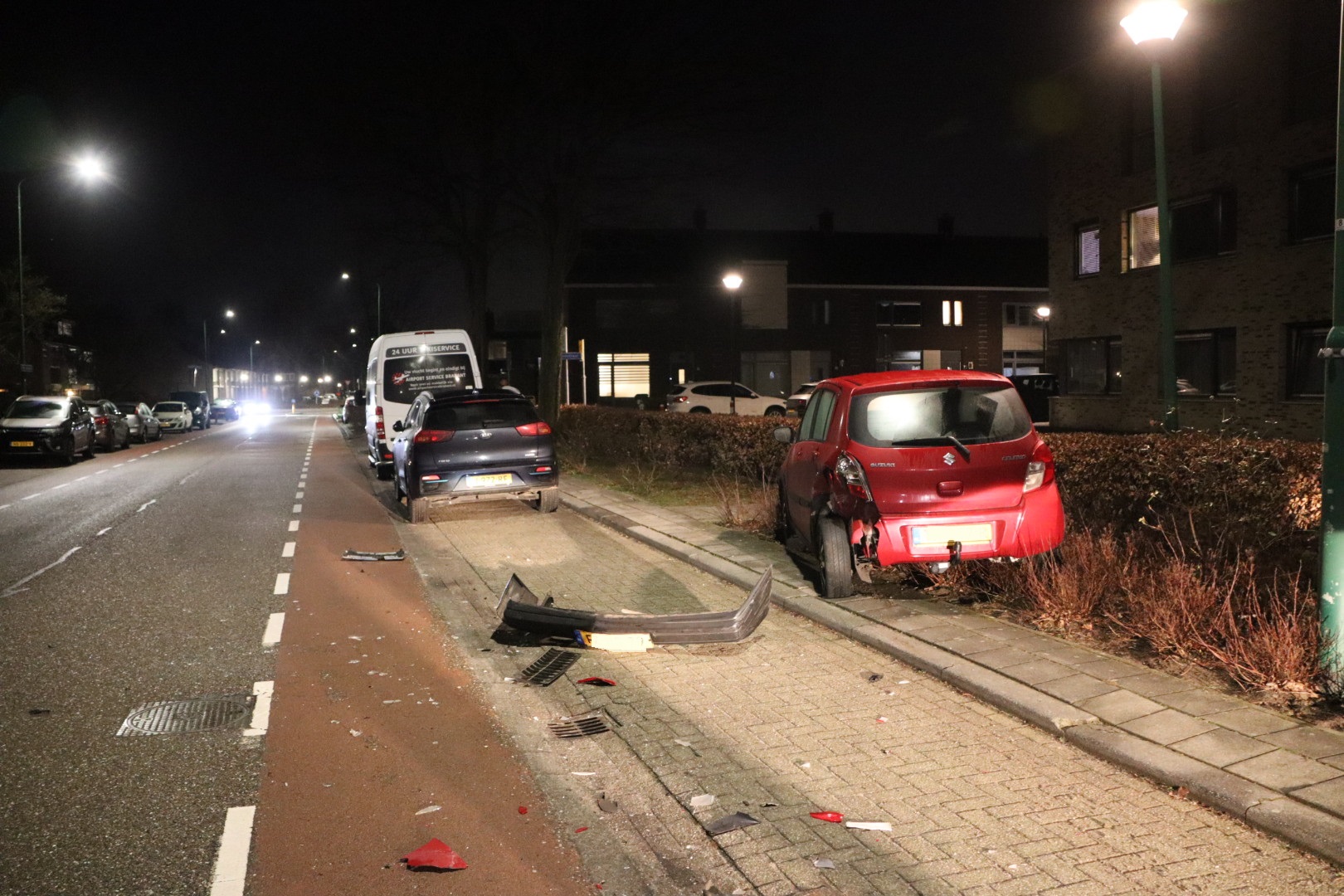 Bij de botsing verloor de bestuurder zijn voorbumper, en een van de geparkeerde auto’s belandde in de struiken. De schade aan de voertuigen is aanzienlijk.