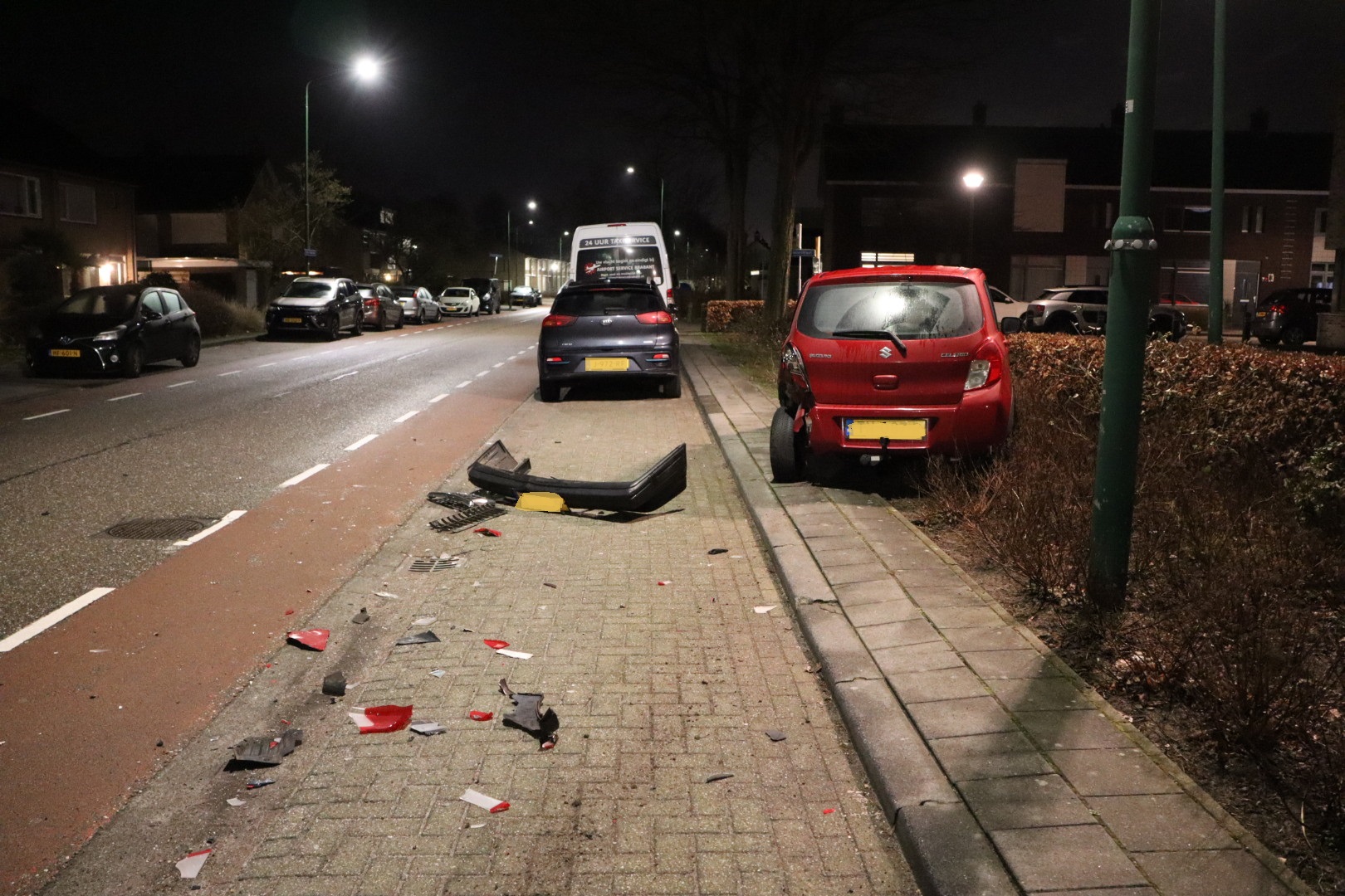 Bij de botsing verloor de bestuurder zijn voorbumper, en een van de geparkeerde auto’s belandde in de struiken. De schade aan de voertuigen is aanzienlijk.