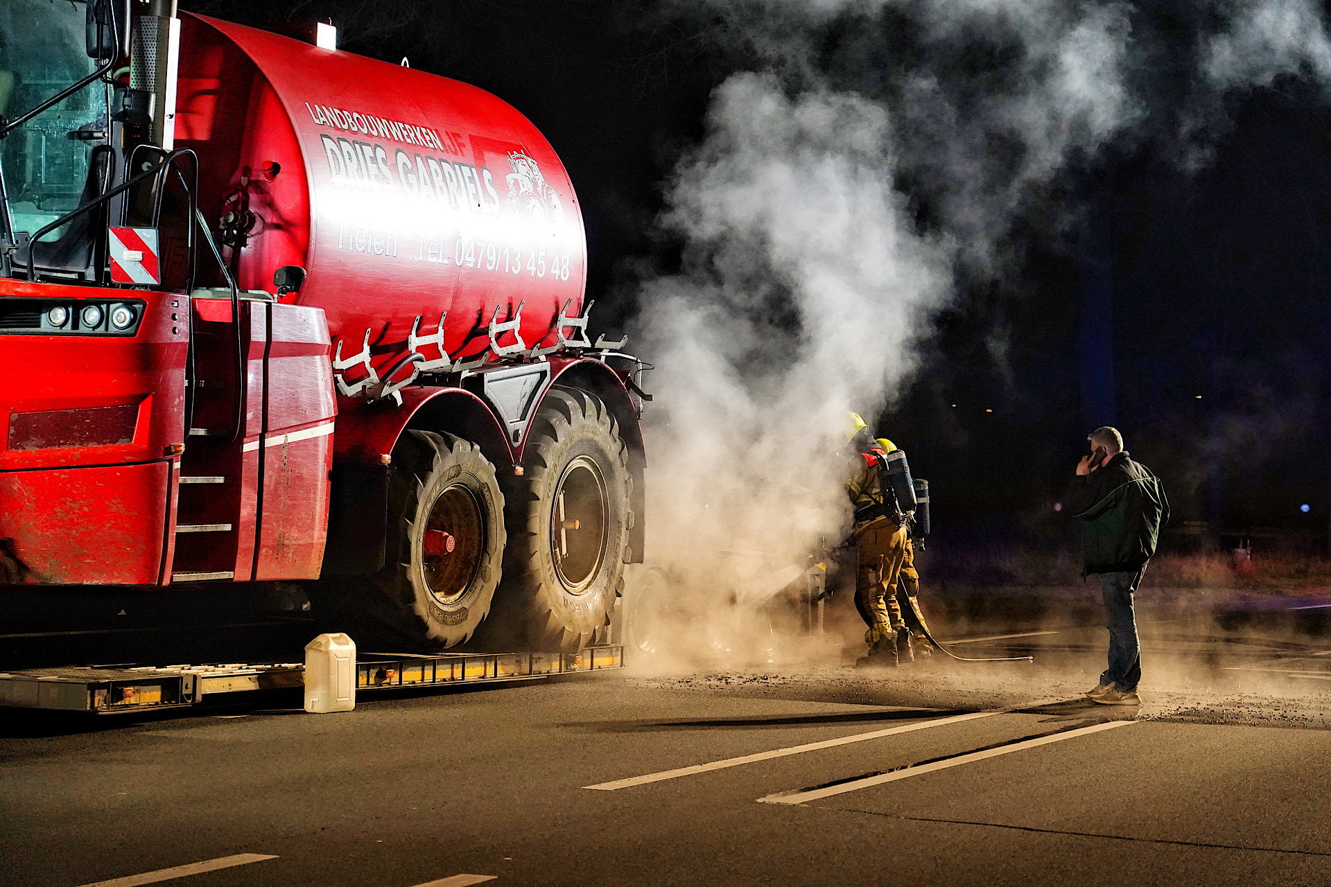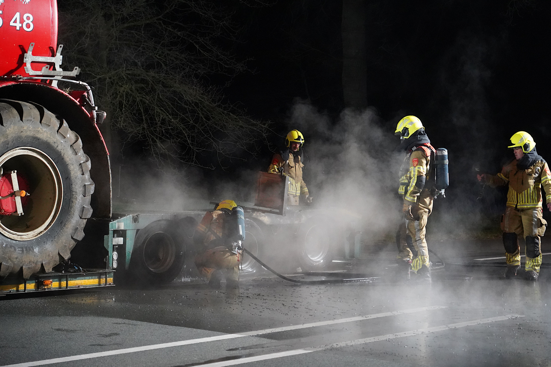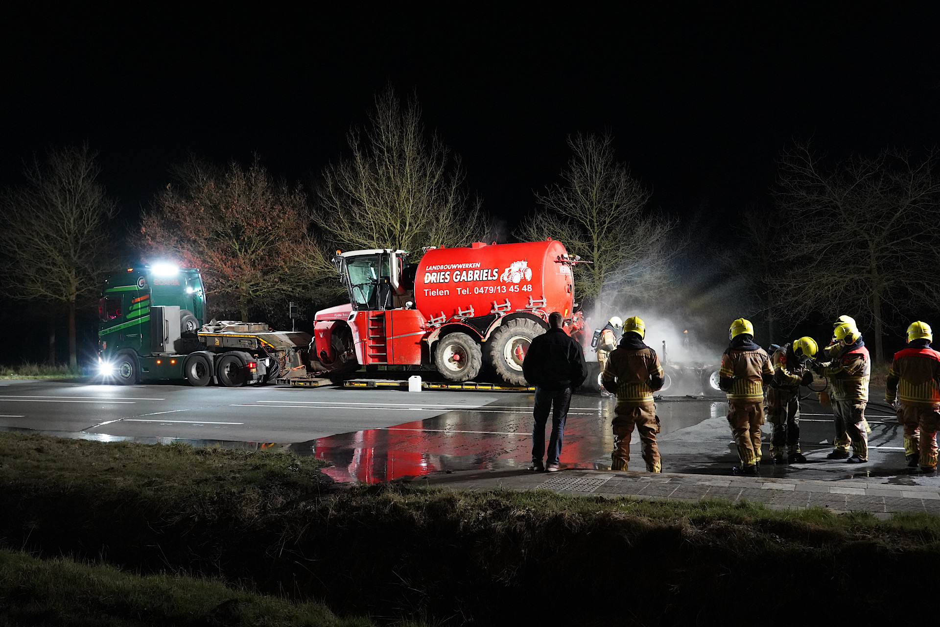 Oplegger in brand: landbouwvoertuig op dieplader blijft gespaard