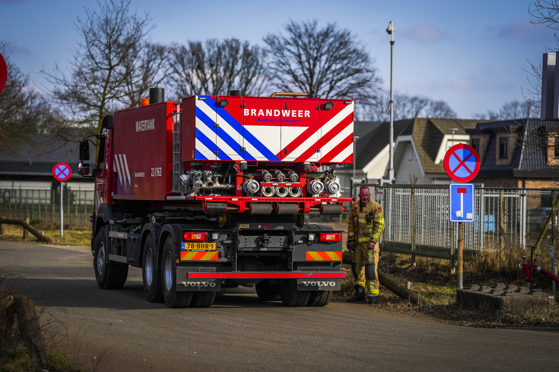 De brand ontstond in een berg metaalafval, vermoedelijk door broei. De brandweer is met een hoogwerker, waterwagen en meerdere blusvoertuigen bezig met blussen.